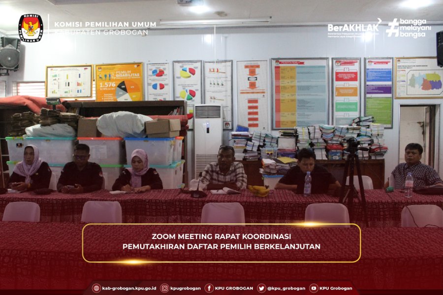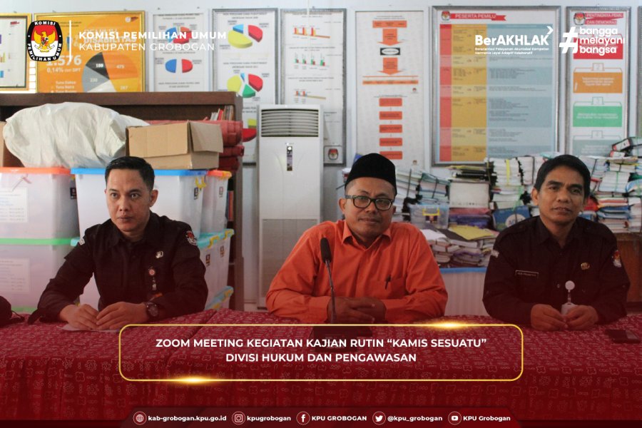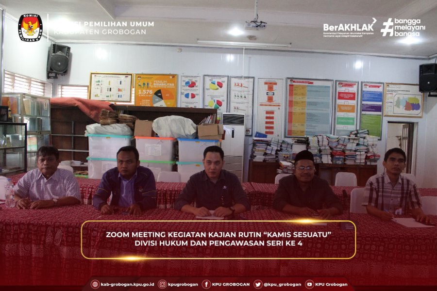 Hai #TemanPemilih, KPU Kabupaten Grobogan mengikuti zoom meeting Kegiatan Kajian Rutin “Kamis Sesuatu” Divisi Hukum dan Pengawasan Seri Ke-4 yang diselenggarakan oleh KPU Provinsi Jawa Tengah, Kamis (5/6/2025). Kegiatan yang bertempat di Aula Kantor KPU Kabupaten Grobogan ini diikuti oleh Ketua KPU Kabupaten Grobogan, Agung Sutopo, Anggota KPU Kabupaten Grobogan Divisi Hukum dan Pengawasan, Muh Syaifudin, Anggota KPU Kabupaten Grobogan Divisi Teknis Penyelenggaraan, Suwiknyo dan Heri Prasetiyo, Kasubbag Teknis Penyelenggaraan Pemilu dan Hukum beserta Staf, Alex Shekar. Hadir juga sebagai pemantik diskusi dalam kegiatan ini Anggota KPU Provinsi Sulawesi Utara Divisi Hukum dan Pengawasan Meidy Y. Tinangon. Adapun episode kali ini mengusung tema Putusan MK PHPU Kepulauan Talaud pada Pemilihan Bupati dan Wakil Bupati Kepulauan Talaud Tahun 2024, dengan menghadirkan narasumber Jekman Wauda Anggota KPU Kabupaten Kepulauan Talaud Divisi Hukum dan Pengawasan dan Anggota KPU Kabupaten Cilacap Divisi Hukum dan Pengawasan Munjiatun Mukaromah. Kegiatan diawali sambutan oleh Anggota KPU Provinsi Jawa Tengah, Akmaliyah. Disampaikan bahwa kegiatan ini untuk meningkatkan kualitas sebagai penyelenggara pemilu. Harapannya kegiatan ini dapat menjadi wadah yang efektif, berbagi pengetahuan, pengalaman, dan best practice dalam menghadapi persoalan hukum berkaitan dengan sengketa pilkada serta meningkatkan kerjasama dan koordinasi dengan stakeholder terkait serta dapat menjadi ajang pendidikan politik atau pendidikan pemilih bagi masyarakat.