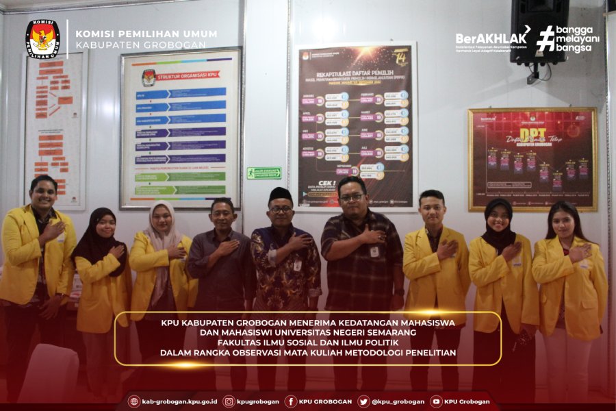 Hai #TemanPemilih, KPU Kabupaten Grobogan menerima kedatangan Mahasiswa dan Mahasiswi Universitas Negeri Semarang Fakultas Ilmu Sosial dan Ilmu Politik dalam rangka observasi mata kuliah metodologi penelitian di Aula Kantor KPU Kabupaten Grobogan, Kamis (15/5/2025). Disampaikan maksud dan tujuan dari pelaksanaan kegiatan ini yaitu guna melakukan penelitian mengenai tingkat partisipasi masyarakat dalam Pilkada dan Pemilu di Kabupaten Grobogan Tahun 2024. KPU Kabupaten Grobogan yang diwakili oleh Muh Syaifudin, S.Pd.I, M.Pd. selaku Anggota KPU Kabupaten Grobogan Divisi Hukum dan Pengawasan bersama dengan Ngatiman, S.E. selaku Anggota KPU Kabupaten Grobogan Divisi Sosdiklih Parmas dan SDM, dan Agung Budi Prasetyo, A.Md. selaku Anggota KPU Kabupaten Grobogan Divisi Perencanaan, Data dan Informasi serta Kasubbag Parmas dan SDM Rama Eka Saputra, S.H. menyambut baik kedatangan mereka. Dalam rangka observasi ini, pada prinsipnya kami menyambut kedatangan adik-adik semua, kedatangan adik-adik semua kami sambut dengan bahagia. ungkap Muh Syaifudin, S.Pd.I., M.Pd. Untuk hal-hal apa yang dibutuhkan nanti bisa dikoordinasikan lebih lanjut dengan subbag serta divisi terkait selaku leading sector dalam kegiatan ini, tambah Beliau. Sebagai pengantar, Ngatiman, S.E. menyampaikan tentang apa saja yang telah dilakukan KPU Kabupaten Grobogan dalam sosialisasi dan pendidikan pemilih. Disampaikan juga mengenai inovasi-inovasi apa yang telah dilakukan KPU Kabupaten Grobogan sebagai langkah upaya untuk meningkatkan partisipasi masyarakat dalam pelaksanaan Pemilu dan Pemilihan di Kabupaten Grobogan Tahun 2024. Selanjutnya, Agung Budi Prasetyo, A.Md. dalam arahannya menyampaikan bahwa diperlukannya instrumen-instrumen pertanyaan, yang berkaitan dengan data dalam penelitian ini. #KPUMelayani