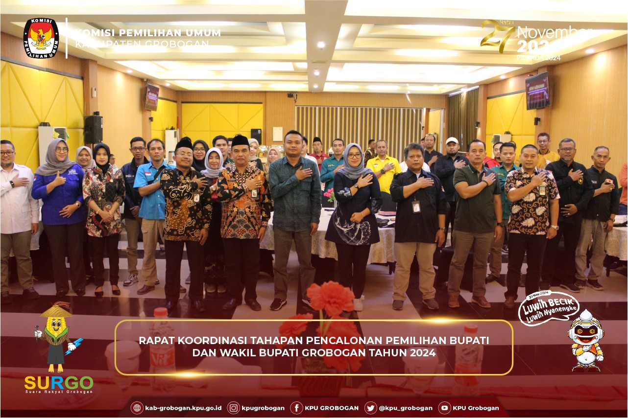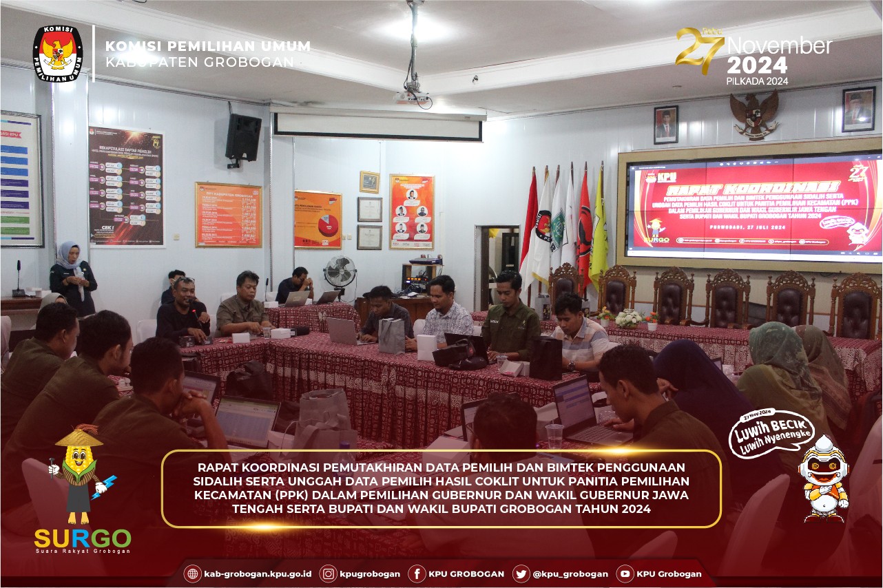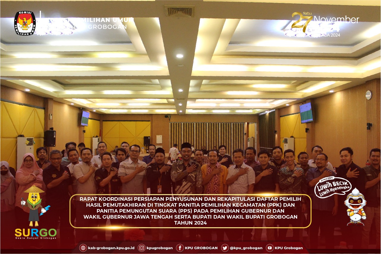 Hai #temanpemilih , KPU Kabupaten Grobogan menyelenggarakan Rapat Koordinasi Persiapan Penyusunan dan Rekapitulasi Daftar Pemilih Hasil Pemutakhiran di Tingkat Panitia Pemilihan Kecamatan (PPK) dan Panitia Pemungutan Suara (PPS) pada Pemilihan Gubernur dan Wakil Gubernur Jawa Tengah serta Bupati dan Wakil Bupati Grobogan Tahun 2024, Rabu (31/7/2024). Acara yang bertempat di Hotel 21 Purwodadi ini diikuti oleh Ketua Panitia Pemilihan Kecamatan (PPK) beserta Anggota Panitia Pemilihan Kecamatan (PPK) Koordinator Pemutakhiran Data se-Kabupaten Grobogan. Acara dibuka oleh Ketua KPU Kabupaten Grobogan yang diwakili oleh Bapak Agung Budi Prasetyo, A.Md. Anggota KPU Kabupaten Grobogan Divisi Perencanaan, Data dan Informasi yang sekaligus menjadi narasumber dalam rapat koordinasi ini. Beliau menyampaikan bahwa terkait dengan pemutakhiran data pemilih, kita sudah menyelesaikan pencocokan dan penelitian (coklit) di tanggal 24 Juli 2024 dan pelaporan di tanggal 25 Juli 2024. Untuk rekap pencocokan dan penelitian (coklit) sudah dilaksanakan dan masih berjalan hingga saat ini tanggal 31 Juli 2024. Disampaikan bahwa agenda selanjutnya adalah persiapan rapat pleno di tingkat Panitia Pemungutan Suara (PPS) dan Panitia Pemilihan Kecamatan (PPK) termasuk disampaikan juga alur pelaksanaan serta hal-hal apa saja yang perlu dipersiapkan. Beliau berharap apa yang menjadi hasil dari rapat pleno tingkat Panitia Pemungutan Suara (PPS) nantinya bisa dibawa dalam rapat koordinasi di tingkat KPU RI dalam rangka penyandingan data tingkat nasional. Beliau menekankan perlunya koordinasi guna penyamaan persepsi data dengan pemangku kepentingan di tiap tingkatan, yang nantinya akan disandingkan dalam sinkronisasi data terlebih dahulu sebelum dilaksanakannya Rapat Pleno Daftar Pemilih Hasil Pemutakhiran (DPHP) menuju Daftar Pemilih Sementara (DPS) di Tingkat Kabupaten. #kpumelayani #pilkadaserentak2024