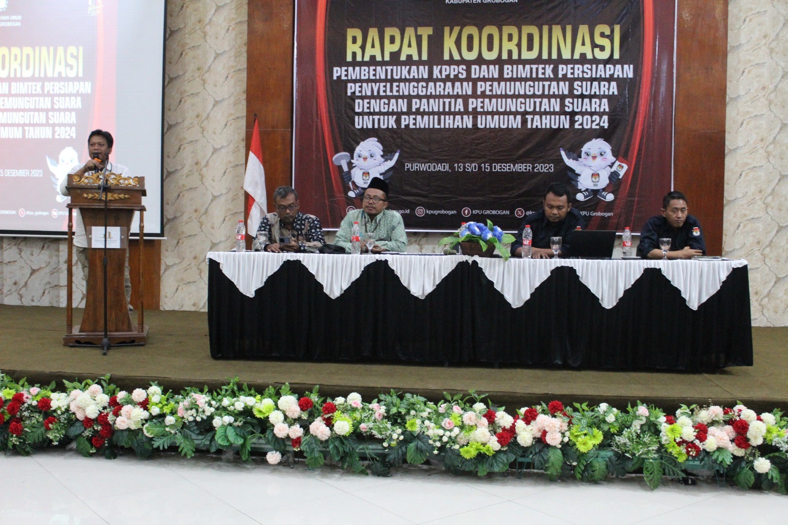 Acara diawali dengan sambutan dari Ketua KPU Kabupaten Grobogan Bapak Agung Sutopo, S.Pi yang sekaligus membuka acara yang kemudian dilanjutkan pemaparan oleh perwakilan dari Polres Grobogan, Bapak AKP Joko Susilo . Beliau menyampaikan bahwa logistik untuk pelaksanaan Pemilu sangat berharga sekali, tidak ternilai, tidak sebanding dengan emas artinya betul-betul keamanan serta keterjaminan logistik untuk pelaksanaan Pemilu menjadi fokus utama, mulai dari penempatan pertama sampai nanti didistribusikan, termasuk pengantisipasian terhadap ancaman alam khususnya untuk daerah-daerah yang tahunan terjadi banjir atau luapan sungai besar. Beliau juga menekankan bahwa seyogyanya kita mempunyai peranan yang sama yang merupakan satu bagian, satu sistem, mempunyai peranan masing-masing dan nantinya dapat menjadi tolak ukur agar pelaksanaan Pemilu nanti bisa berjalan lancar, maka dibutuhkan saling kerja sama, bersatu padu dan fokus sehingga dapat meminimalisir potensi masalah.