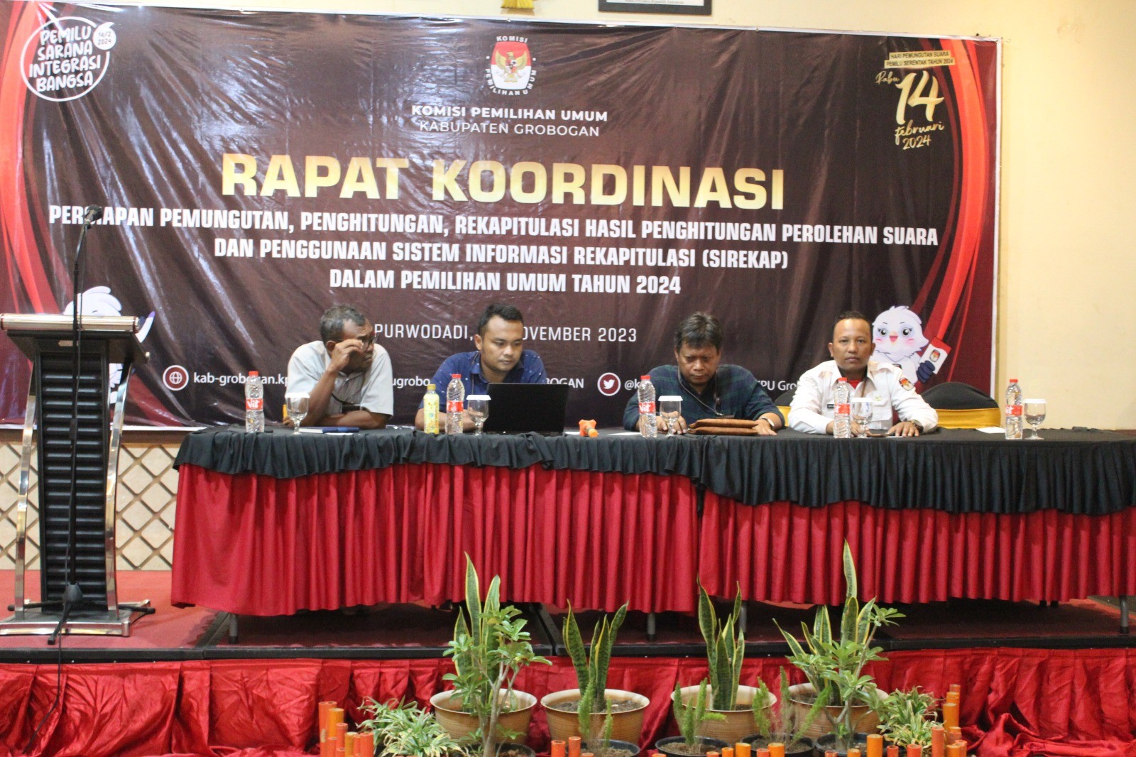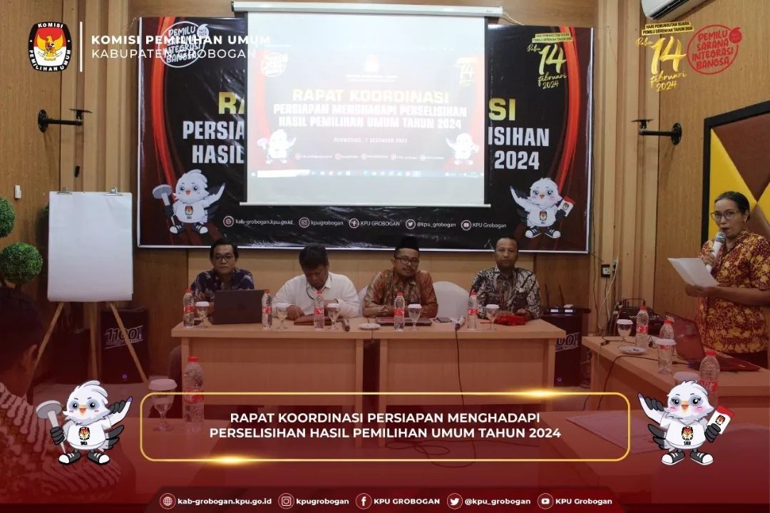 PURWODADI - Senin (4/12/2023), KPU Kabupaten Grobogan mengadakan Bimbingan Teknis Pengamanan Siber dan Pengelolaan Media Sosial Bagi PPK se-Kabupaten Grobogan pada Pemilihan Umum Tahun 2024 dengan narasumber Bapak Dwi Setiawan, M.Kom dari Universitas Sains dan Teknologi Komputer Semarang, dan Ibu Sindhu Rakasiwi, M.Kom dari Universitas Dian Nuswantoro Semarang. Kegiatan yang bertempat di Hotel 21 Purwodadi ini diikuti oleh Anggota Panitia Pemilihan Kecamatan (PPK) Koordinator Tahapan Pemutakhiran dan Data, Koordinator Tahapan Sosialisasi dan Staf Sekretariat PPK se-Kabupaten Grobogan. Bertindak sebagai moderator dalam kegiatan ini Kasubbag Perencanaan, Data dan Informasi Bapak Moh. Amin Nurhadi, S.Kom. Acara diawali sambutan dari Ketua KPU Kabupaten Grobogan, yang diwakili oleh Anggota KPU Kabupaten Grobogan Divisi Perencanaan, Data dan Informasi, Bapak Agung Budi Prasetyo, A.Md yang sekaligus membuka acara. Serangkaian acara diisi dengan pemaparan materi oleh narasumber yaitu Bapak Dwi Setiawan, M.Kom dengan materi Pentingnya Peningkatan Kesadaran Pelindungan Data Pribadi Masyarakat dan Ibu Sindhu Rakasiwi, M.Kom dengan materi Tips Meracik Konten Informatif di Media Sosial dengan Cerdas.