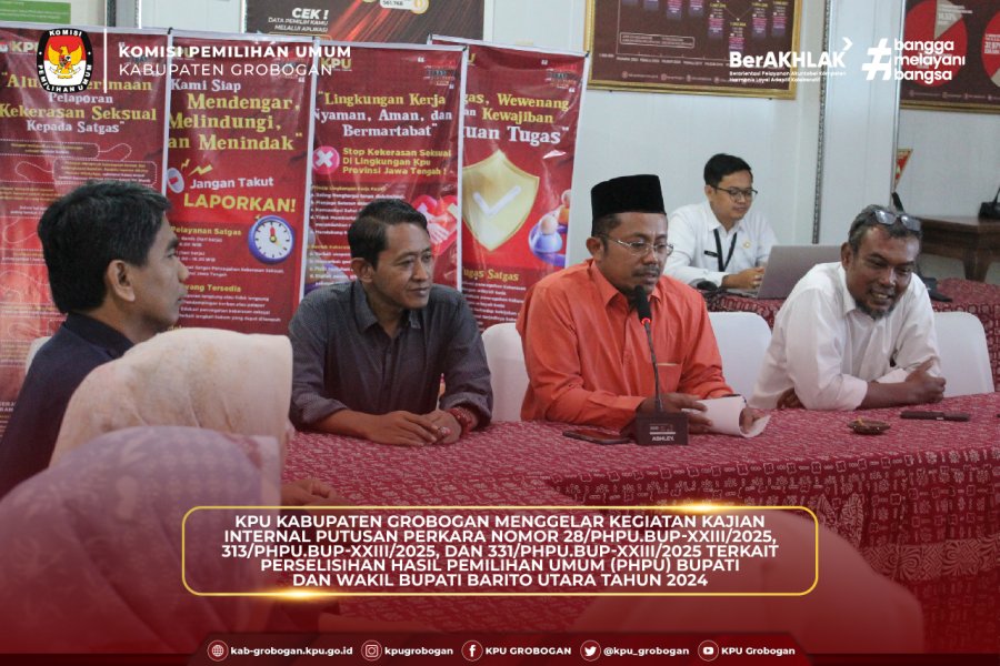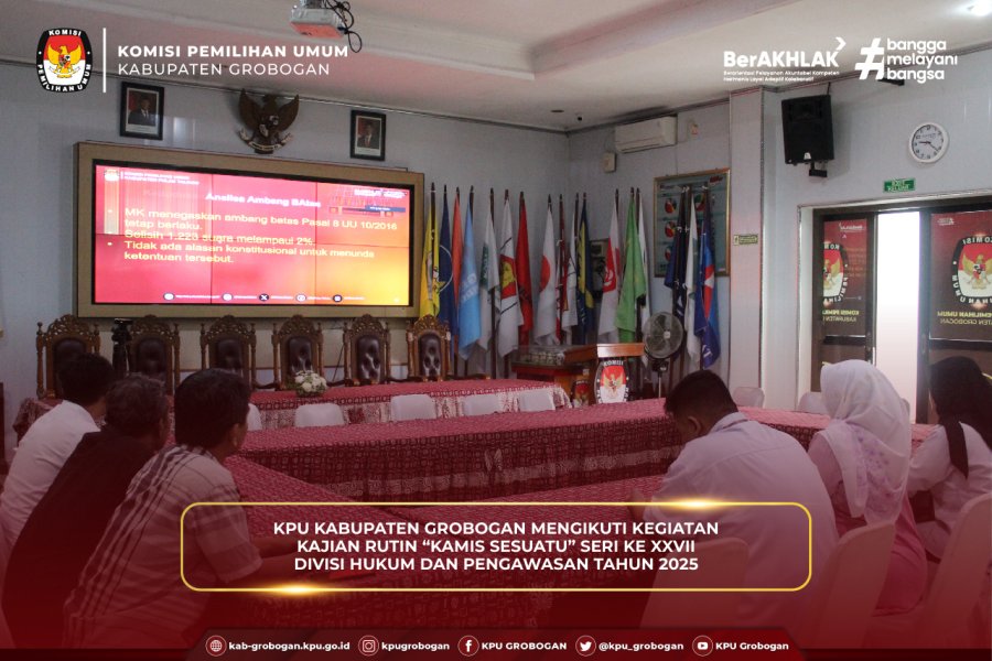 Hai #TemanPemilih, KPU Kabupaten Grobogan mengikuti kegiatan Kajian Rutin “Kamis Sesuatu” Seri ke-XXVII Divisi Hukum dan Pengawasan Tahun 2025 yang diselenggarakan oleh KPU Provinsi Jawa Tengah, Kamis (13/11/2025). Kajian kali ini mengangkat tema “Putusan Perkara Nomor 267/PHPU.BUP-XXIII/2025 Bupati dan Wakil Bupati Pulau Taliabu Tahun 2024.” Kegiatan yang digelar secara daring ini diikuti oleh KPU Kabupaten/Kota se-Jawa Tengah dengan menghadirkan tiga narasumber utama, yakni Mukhtar Yusuf (Kadiv Hukum dan Pengawasan KPU Provinsi Maluku Utara), Fatmawati (Kadiv Hukum dan Pengawasan KPU Kabupaten Pulau Taliabu), dan Akhmad Nurmuladi (Kadiv Hukum dan Pengawasan KPU Kabupaten Pemalang). Acara dibuka oleh Muslim Aisha, Kadiv Hukum dan Pengawasan KPU Provinsi Jawa Tengah. Dalam sambutannya, ia menyampaikan apresiasi atas keberlangsungan kegiatan yang telah memasuki seri ke-27. Menurutnya, kasus sengketa hasil Pilkada Pulau Taliabu menjadi pembelajaran penting bagi penyelenggara pemilu di daerah lain, khususnya Jawa Tengah, terkait persoalan teknis di lapangan seperti dugaan pemilih ganda, pemilih di luar DPT, serta tindak lanjut terhadap rekomendasi Bawaslu. “Kita akan belajar banyak dari Pulau Taliabu tentang bagaimana mempersiapkan, menghadapi, dan memproses sengketa hasil Pilkada. Kasus di sana sangat dekat dengan potensi sengketa yang bisa terjadi di daerah lain,” ungkap Muslim Aisha. Sementara itu, Mukhtar Yusuf dalam paparannya menjelaskan bahwa dari 19 perkara yang diajukan ke Mahkamah Konstitusi (MK) pada Pilkada 2024 di Maluku Utara, hanya Kabupaten Pulau Taliabu yang diperintahkan untuk melaksanakan Pemungutan Suara Ulang (PSU), sebagaimana amar Putusan MK Nomor 267/PHPU.BUP-XXIII/2025. Lebih lanjut, Fatmawati dari KPU Kabupaten Pulau Taliabu bersama Akhmad Nurmuladi dari KPU Kabupaten Pemalang dalam paparannya menyampaikan kajian dan analisis hukum atas kasus sengketa Pilkada Pulau Taliabu sebagai bentuk pembelajaran bagi jajaran penyelenggara pemilu. Keduanya memaparkan secara rinci latar belakang perkara yang bermula dari keberatan pasangan calon nomor urut 2, Citra Puspasari Mus dan La Utu Ahmadi, yang menilai telah terjadi sejumlah dugaan permasalahan administratif dan pelanggaran teknis. Dugaan tersebut meliputi pemilih yang menggunakan hak pilih lebih dari satu kali, pemilih ganda, pemilih yang terdaftar di DPT daerah lain, pendamping pemilih yang tidak mengisi formulir pendamping, serta perbedaan tafsir terhadap surat suara sah dan tidak sah, termasuk rekomendasi PSU dari Bawaslu. Berdasarkan hasil pemeriksaan Mahkamah Konstitusi (MK), PSU akhirnya ditetapkan hanya di 9 TPS. Melalui kegiatan ini, diharapkan KPU Kabupaten Grobogan dapat semakin memperkaya pengetahuan dan pemahaman terkait penanganan sengketa hasil pemilihan.