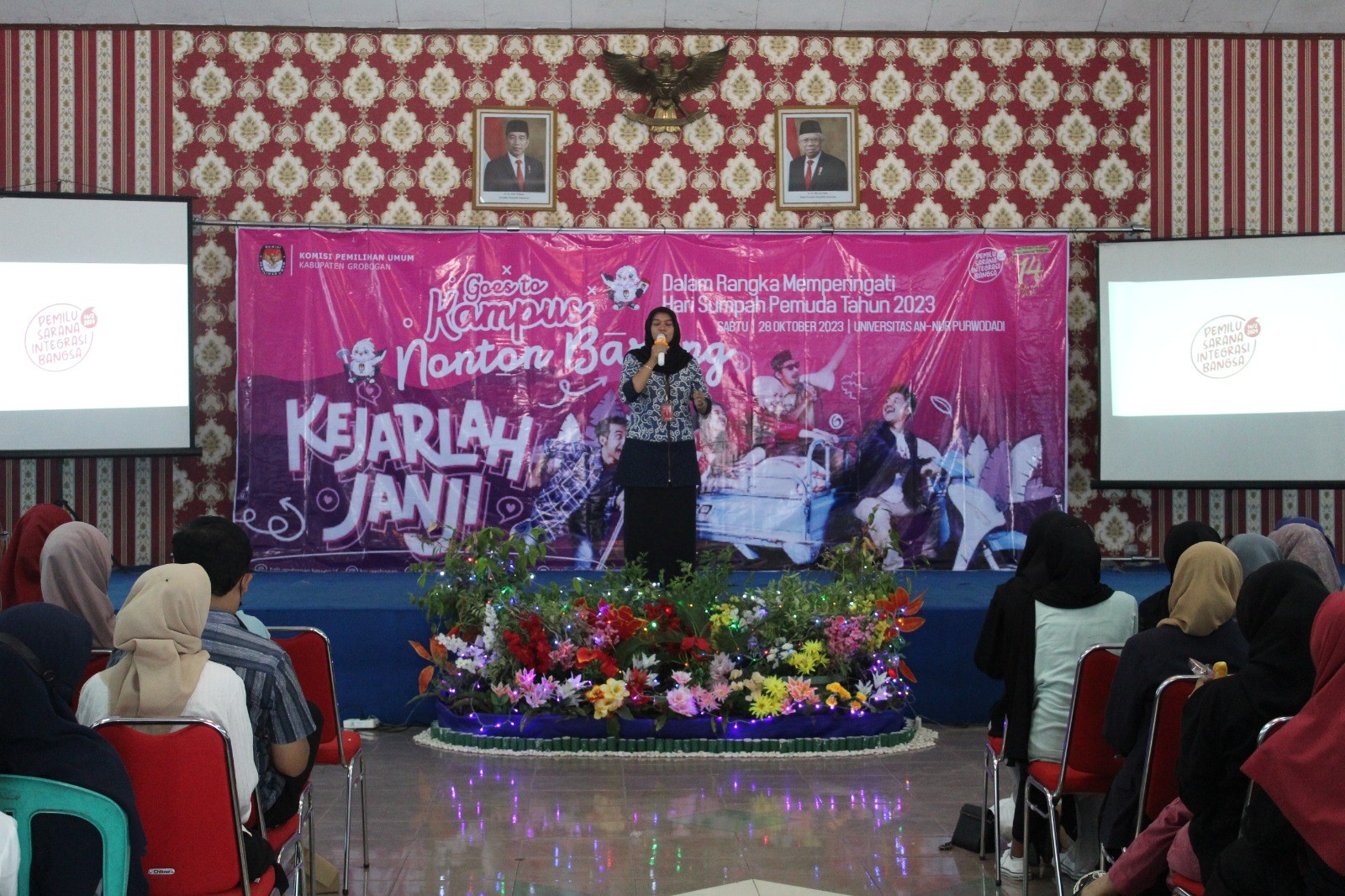 PURWODADI- Dalam rangka memperingati Hari Sumpah Pemuda Tahun 2023 yang jatuh pada hari Sabtu tanggal 28 Oktober 2023, KPU Kabupaten Grobogan mengadakan kegiatan Nonton Bareng Film "Kejarlah Janji". Kegiatan ini dilaksanakan di Universitas An-Nur Purwodadi yang beralamat di Jl. Gajahmada No. 7 Purwodadi.