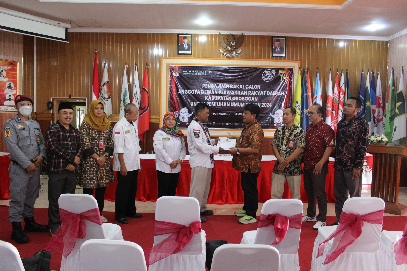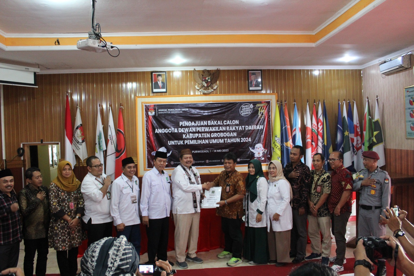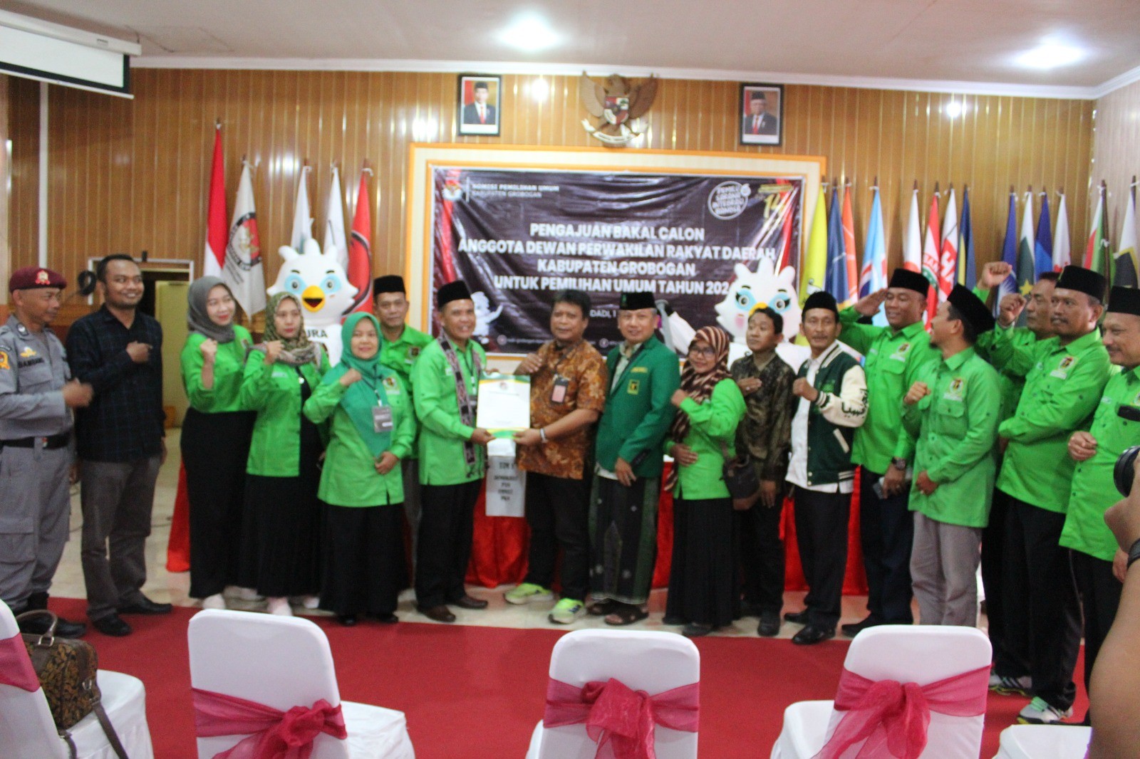 PURWODADI - Sabtu, 13 Mei 2023 pukul 14.20 WIB, Partai Kebangkitan Bangsa (PKB) datang ke kantor KPU Kabupaten Grobogan dengan membawa berkas pengajuan bakal calon Anggota DPRD Kabupaten yang sebelumnya telah diunggah di Sistem Informasi Pencalonan (SILON). Hadir pada saat itu adalah jajaran Ketua, Sekretaris, Bendahara dan Petugas Penghubung PKB tingkat Kabupaten Grobogan. Kehadiran Partai PKB diterima dengan hangat oleh Ketua KPU Kabupaten Grobogan. Setelah menyematkan cindera mata, Agung Sutopo, secara resmi menyambut rombongan Partai PKB. Berkesempatan memberikan sambutan adalah Anggota KPU Kabupaten Grobogan Divisi Teknis Penyelenggaraan Bapak Suwiknyo, S. PD. I. Dalam sambutannya Suwiknyo mengucapkan apresiasi kepada Partai PKB karena telah berhasil menyelesaikan tahapan pendaftaran pengajuan bakal calon Anggota DPRD Kabupaten. Suwiknyo juga berharap semoga tahapan ini bisa berjalan lancar hingga penetapan DCT. Sementara Ketua Partai PKB tingkat Kabupaten Grobogan Mustain, S. Ag berharap, dengan proses pengajuan bakal calon Anggota DPRD ini Partai PKB dapat turut serta meramaikan pesta demokrasi yang akan digelar tahun 2024 mendatang, tak lupa beliau mengucapkan terimakasih kepada KPU Kabupaten Grobogan atas penyambutan yang dilakukan. Setelah dokumen pengajuan bakal calon Anggota DPRD Kabupaten Grobogan diterima oleh Ketua KPU Kabupaten Grobogan, untuk kemudian dilakukan pemeriksaan, dan dinyatakan lengkap. Berita Acara dan Tanda Terima Penerimaan Berkas Pengajuan diserahkan oleh Agung Sutopo, kepada Ketua Partai PKB tingkat Kabupaten Grobogan.