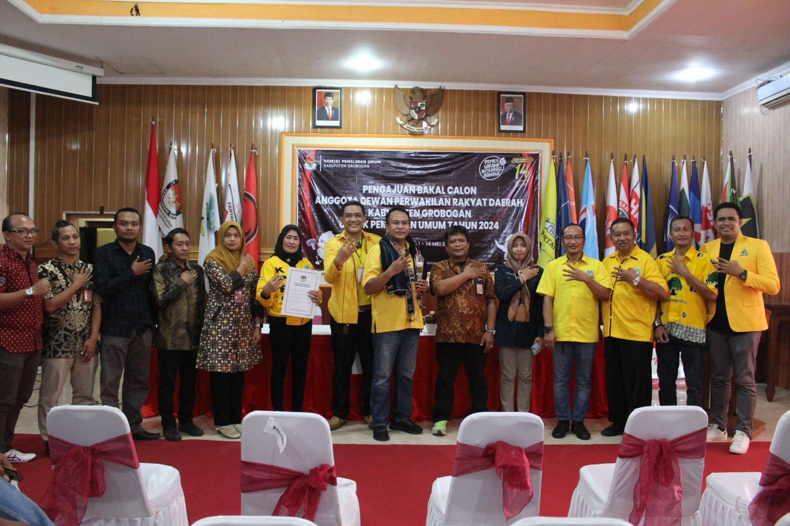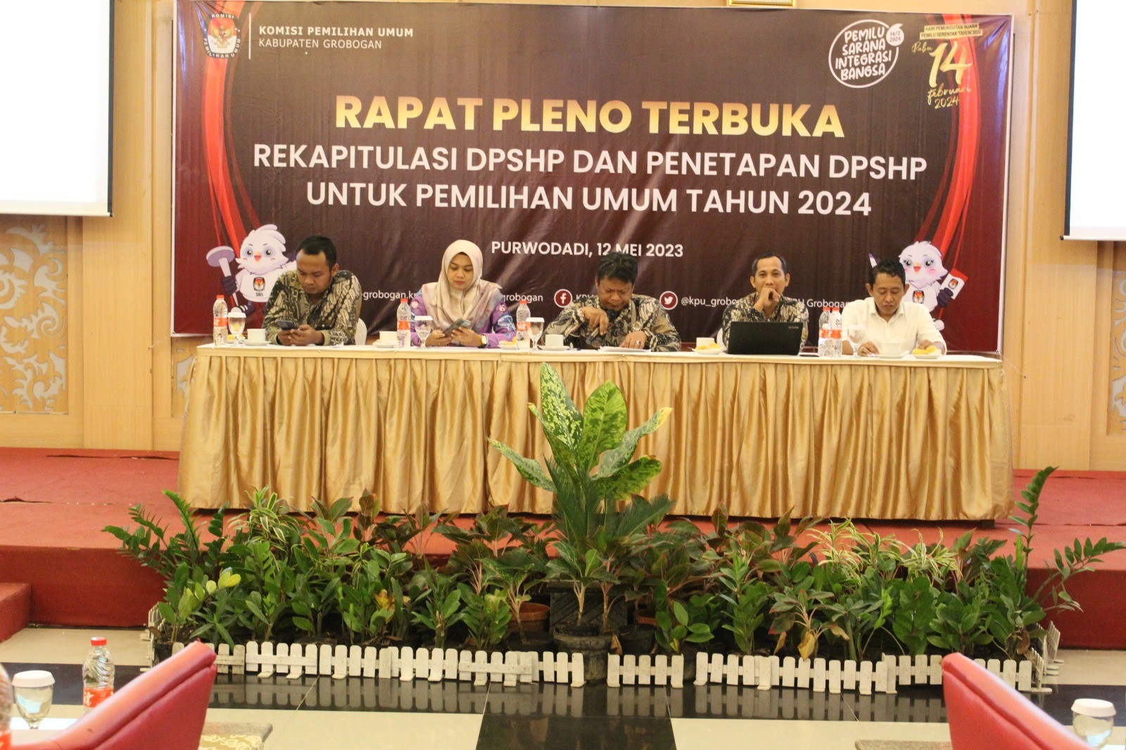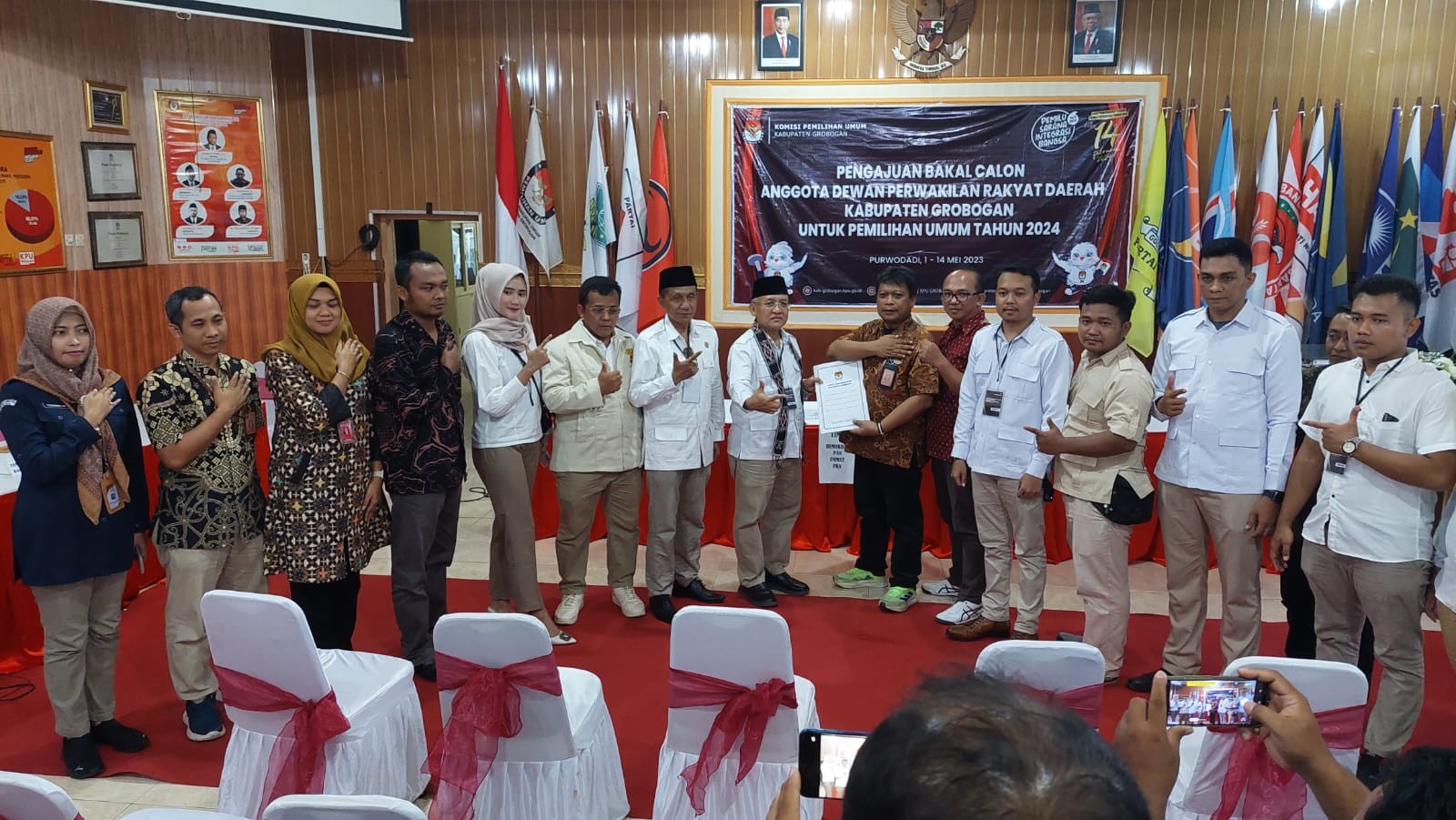 PURWODADI - Sabtu, 13 Mei 2023 pukul 14.20 WIB, Partai Kebangkitan Bangsa (PKB) datang ke kantor KPU Kabupaten Grobogan dengan membawa berkas pengajuan bakal calon Anggota DPRD Kabupaten yang sebelumnya telah diunggah di Sistem Informasi Pencalonan (SILON). Hadir pada saat itu adalah jajaran Ketua, Sekretaris, Bendahara dan Petugas Penghubung PKB tingkat Kabupaten Grobogan. Kehadiran Partai PKB diterima dengan hangat oleh Ketua KPU Kabupaten Grobogan. Setelah menyematkan cindera mata, Agung Sutopo, secara resmi menyambut rombongan Partai PKB. Berkesempatan memberikan sambutan adalah Anggota KPU Kabupaten Grobogan Divisi Teknis Penyelenggaraan Bapak Suwiknyo, S. PD. I. Dalam sambutannya Suwiknyo mengucapkan apresiasi kepada Partai PKB karena telah berhasil menyelesaikan tahapan pendaftaran pengajuan bakal calon Anggota DPRD Kabupaten. Suwiknyo juga berharap semoga tahapan ini bisa berjalan lancar hingga penetapan DCT. Sementara Ketua Partai PKB tingkat Kabupaten Grobogan Mustain, S. Ag berharap, dengan proses pengajuan bakal calon Anggota DPRD ini Partai PKB dapat turut serta meramaikan pesta demokrasi yang akan digelar tahun 2024 mendatang, tak lupa beliau mengucapkan terimakasih kepada KPU Kabupaten Grobogan atas penyambutan yang dilakukan. Setelah dokumen pengajuan bakal calon Anggota DPRD Kabupaten Grobogan diterima oleh Ketua KPU Kabupaten Grobogan, untuk kemudian dilakukan pemeriksaan, dan dinyatakan lengkap. Berita Acara dan Tanda Terima Penerimaan Berkas Pengajuan diserahkan oleh Agung Sutopo, kepada Ketua Partai PKB tingkat Kabupaten Grobogan.