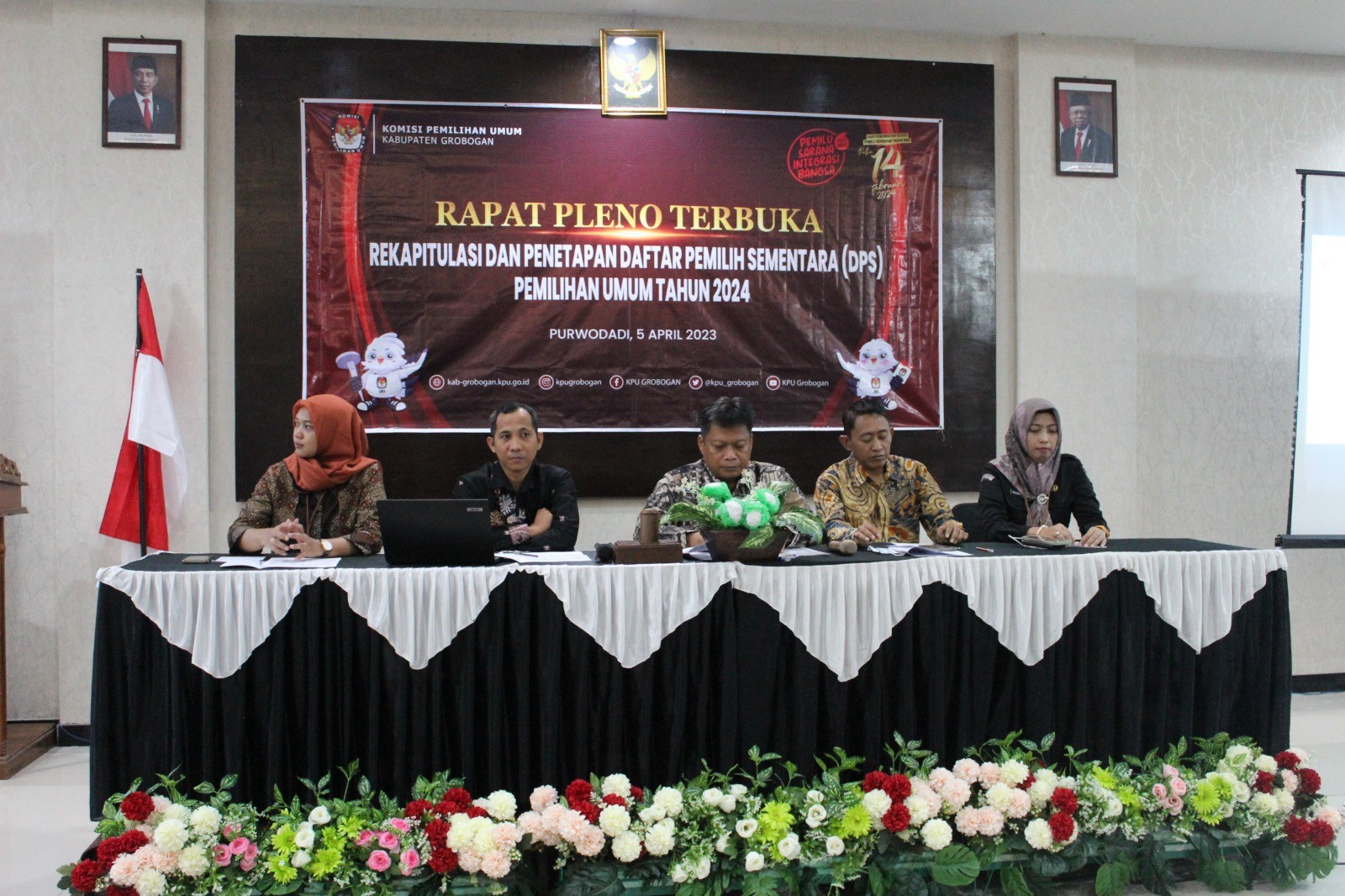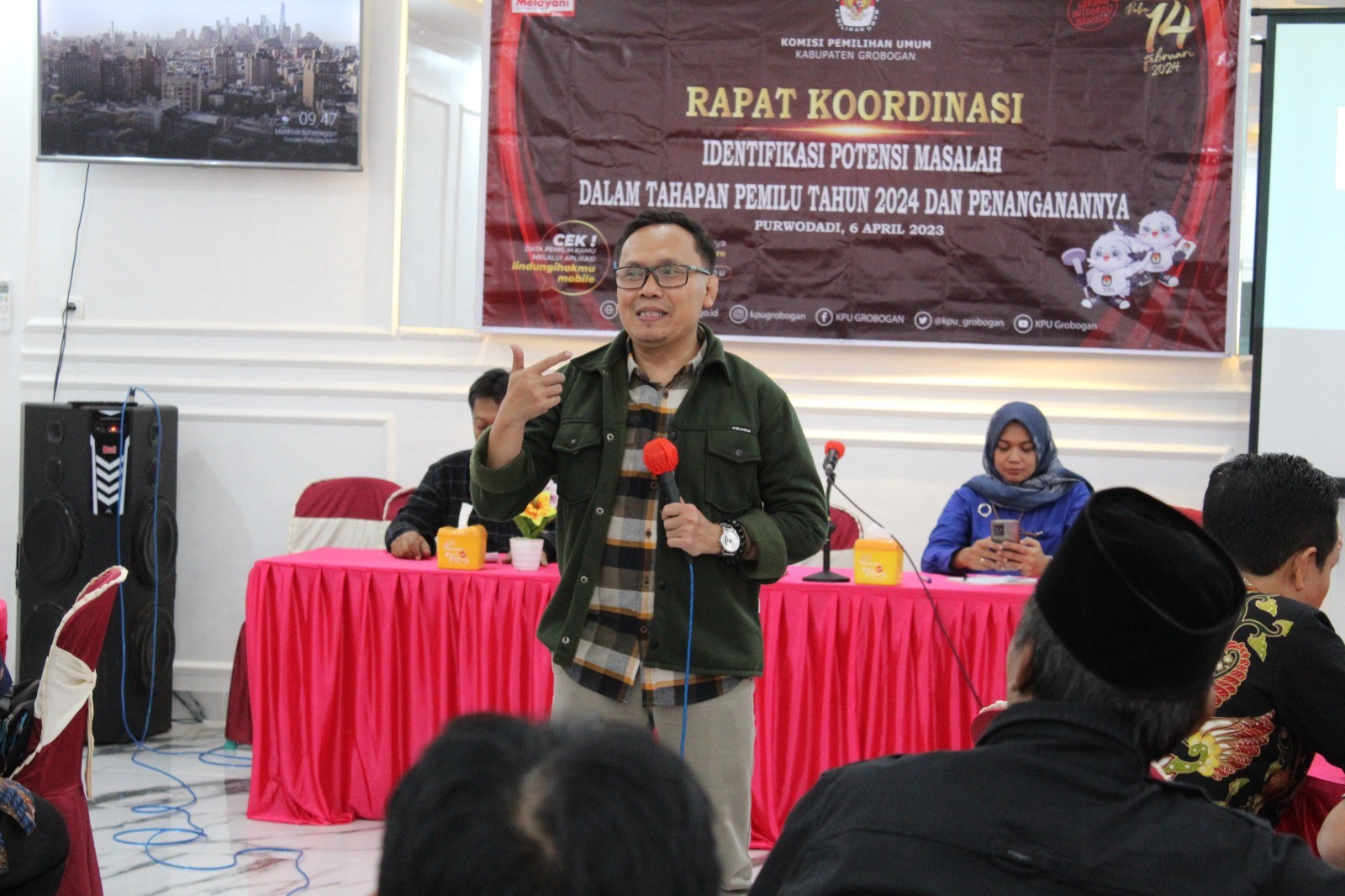 PURWODADI - Senin, 3 April 2023 bertempat di Hotel Front One Purwodadi, KPU Kabupaten Grobogan menggelar kegiatan Sosialisasi Daerah Pemilihan dan Alokasi Kursi DPR RI, DPRD Provinsi Jawa Tengah dan DPRD Kabupaten Grobogan serta Pencanangan dan Pembangunan Zona Integritas Menuju Wilayah Bebas dari Korupsi dan Wilayah Birokrasi Bersih dan Melayani. Turut hadir dalam kegiatan tersebut Forkopimda Kabupaten Grobogan, Asisten Pemerintahan dan Kesra Setda Kabupaten Grobogan, Bakesbangpol Kabupaten Grobogan, Bawaslu Kabupaten Grobogan, Partai Politik Peserta Pemilu 2024, Ketua Panitia Pemilihan Kecamatan (PPK) se- Kabupaten Grobogan dan Perwakilan Ormas Kabupaten Grobogan. Kegiatan dibuka oleh Ketua KPU Kabupaten Grobogan Bapak Agung Sutopo, S.Pi yang kemudian dilanjutkan sambutan oleh Bupati Grobogan Ibu Hj. Sri Sumarni, SH, MM.