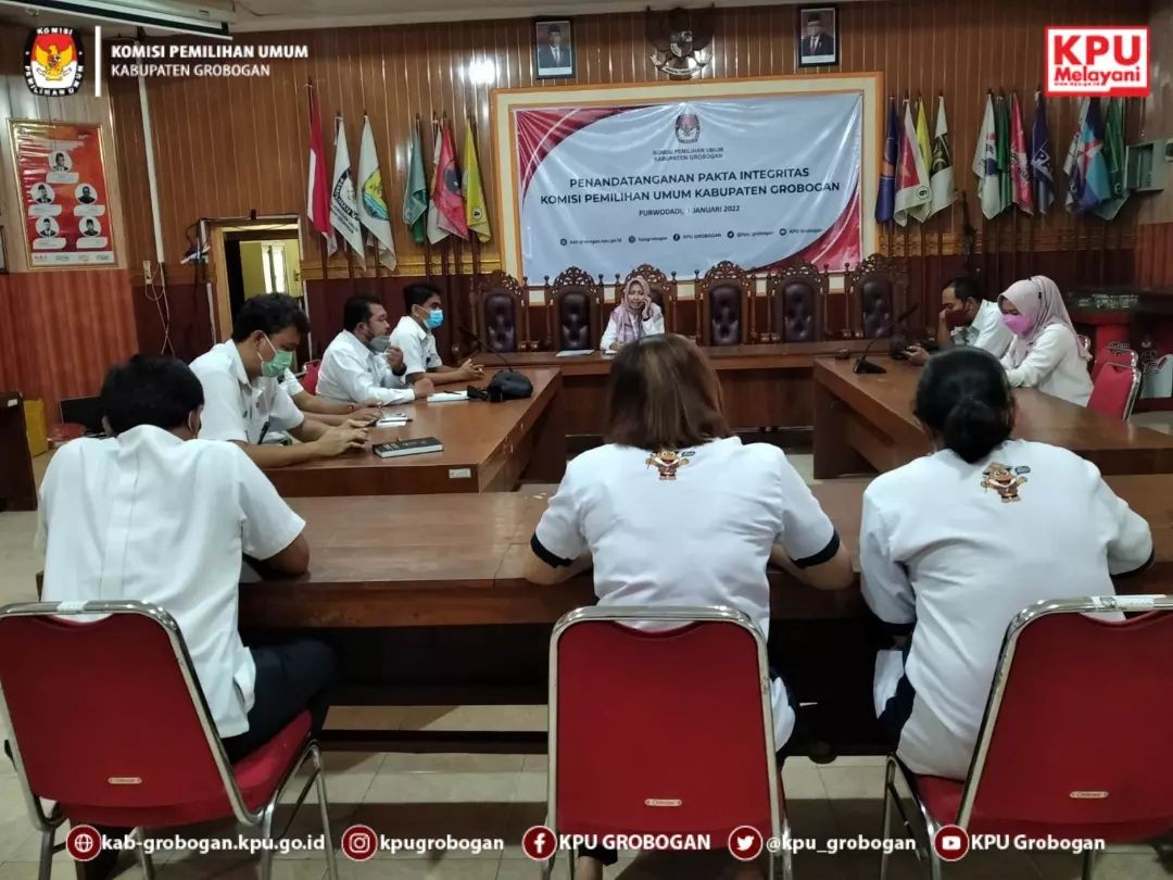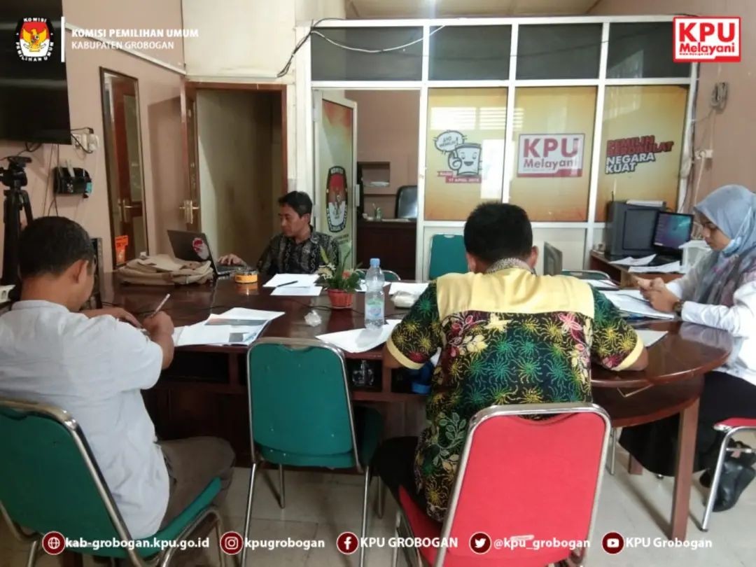 Hari senin ini, pukul 08.30 WIB, seperti biasanya, Skretariat KPU kabupaten Grobogan menggelar rapat rutin tiap hari senin. Dipimpin oleh Sekretaris KPU Kabupaten Grobogan Yudhaviska AS, SE, rapat ini berjalan lancar. Rapat rutin ini diadakan untuk mengevaluasi kegiatan yang telah dilaksanakan pada minggu yang lalu, dan merencanakan kegiatan yang akan dilaksanakan pada minggu yang akan datang.