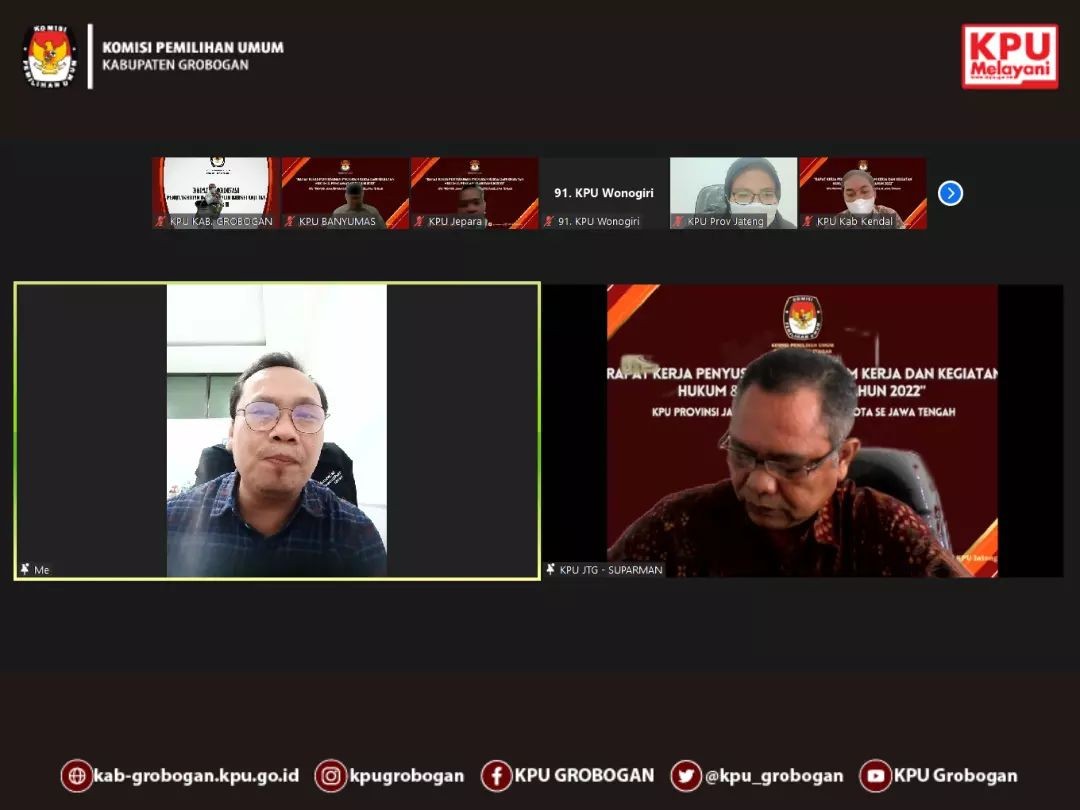 Dalam rangka meningkatkan kualitas pelayanan publik dan demi mewujudkan birokrasi yang bersih dan akuntabel, efektif dan efisien, Komisi Pemilihan Umum Provinsi Jawa Tengah mengadakan rapat kerja penyusunan program kerja dan kegiatan hukum dan pengawasan Tahun 2022. Raker berlangsung secara daring pada Kamis siang (20/1). Anggota KPU Kabupaten Grobogan yang mengikuti raker adalah Sulistiyorini beserta Staf Sub Bagian Hukum . Rapat dipandu oleh Suparman (Kepala Bagian Hukum dan SDM) Sekretariat KPU Provinsi Jawa Tengah. Pemateri utama adalah Muslim Aisha (Anggota KPU Provinsi Jawa Tengah) yang membidangi Hukum, Pengawasan dan SDM. Salah satu kegiatan yang menjadi fokus divisi hukum dan pengawasan KPU adalah pembentukan ruang JDIH. Beberapa hal pokok yang dibahas adalah penyusunan regulasi, SOP, menelaah hukum dan advokasi, penyelesaian sengketa sampai pada dokumentasi hukum, serta melakukan pengawasan dan pengendalian internal berupa SPIP rutin. “Beberapa hal yang menjadi persoalan di tahun 2021 kita inventarisir di awal tahun 2022 sehingga kedepan semua kegiatan terencana dengan baik, dan pada tahun 2022 bisa menyusun program dan penganggaran yang lebih baik” jelas Muslim. Muslim Aisha mengagendakan kegiaran rapat kerja penyusunan keputusan, supervisi dan monitoring serta evaluasi demi penguaatan kapasitas. “Selain raker supervisi, bimtek, monitoring dan evaluasi, kita juga akan melaksanakan bimbingan teknis penyusunan regulasi. Program yang harus dilakukan jelang tahapan pemilihan serentak tahun 2024 adalah penyusunan keputusan terkait pemilihan gubernur, inventarisasi kebutuhan keputusan untuk tahapan pelaksanaan serta workshop review terhadap keputusan yang dikeluarkan KPU. Lebih terang Muslim mengatakan bahwa bentuk kegiatan yang di program antara lain Forum Group Discusion (FGD) supervisi monitoring kebutuhan KPU Provinsi dan kabupaten/ kota serta jajarannya, kajian produk hukum, rapat kerja dengan jajaran terkait. Muslim Aisha juga menyinggung soal pengembangan JDIH dan penyuluhan produk hukum. Diantara yang dimungkinkan adalah pembangunan ruang JDIH, inventarisasi produk hukum, penyuluhan produk hukum dan pengawasan dan pengendalian SPIP. Memberikan arahan bagi KPU kabupaten /kota agar tidak mengalami kendala pelaporan SPIP, untuk intens mengingatkan anggota satgas melalui sekretaris kabupaten/kota sebagai ketua satgas SPIP. Untuk pengelolaan JDIH, memberi masukan untuk meningkatkan inovasi dan kreatifitas dalam pembuatan konten sosialisasi serta membuat ruang JDIH. By : MM