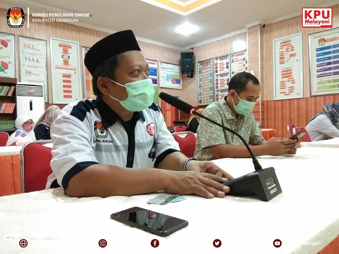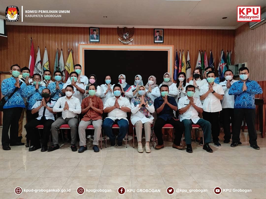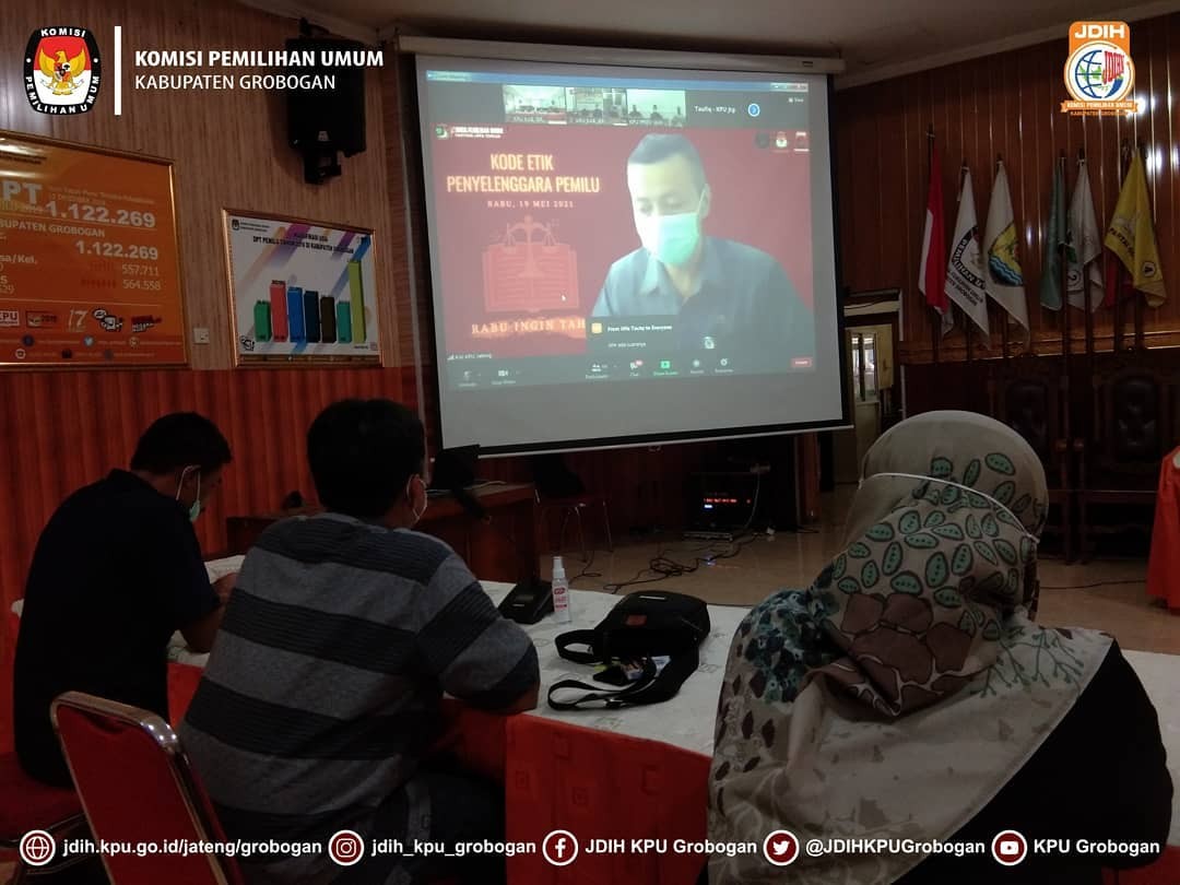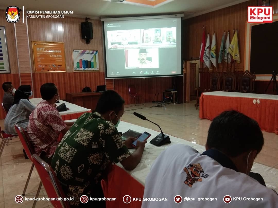 Sesuai dengan undangan Pemerintah Kabupaten Grobogan Nomor : 005/1060/VIII/2021 Perihal Halal Bihalal Secara Virtual, KPU Kabupaten Grobogan mengikuti acara tersebut dengan zoom meeting. Seperti yang telah kita ketahui bersama bahwa selama terjadi pandemi Covid-19, hampir seluruh kegiatan yang melibatkan kehadiran banyak orang dilakukan secara daring. Hal ini bertujuan untuk mengurangi kerumunan dan mencegah penularan virus Covid-19. Halal bihalal dimulai pukul 09.00 WIB dan dihadiri oleh Bupati, Wakil Bupati, Sekda Grobogan dan seluruh Dinas, Instansi dan OPD yang berada di wilayah Kabupaten Grobogan. Pada kesempatan ini Bupati Grobogan Hj. Sri Sumarni, SH, MM selain menyampaikan selamat merayakan Idul Fitri 1442 Hijriah, juga tetap menghimbau agar para Kepala Dinas, Instansi dan OPD tetap memperhatikan protokol kesehatan, agar dapat mencegah penularan virus Covid-19. Semoga dengan acara halal bihalal secara virtual ini, dapat tetap menjaga terjalinnya tali silaturahmi antar Dinas, Instansi dan OPD di wilayah Kabupaten Grobogan.