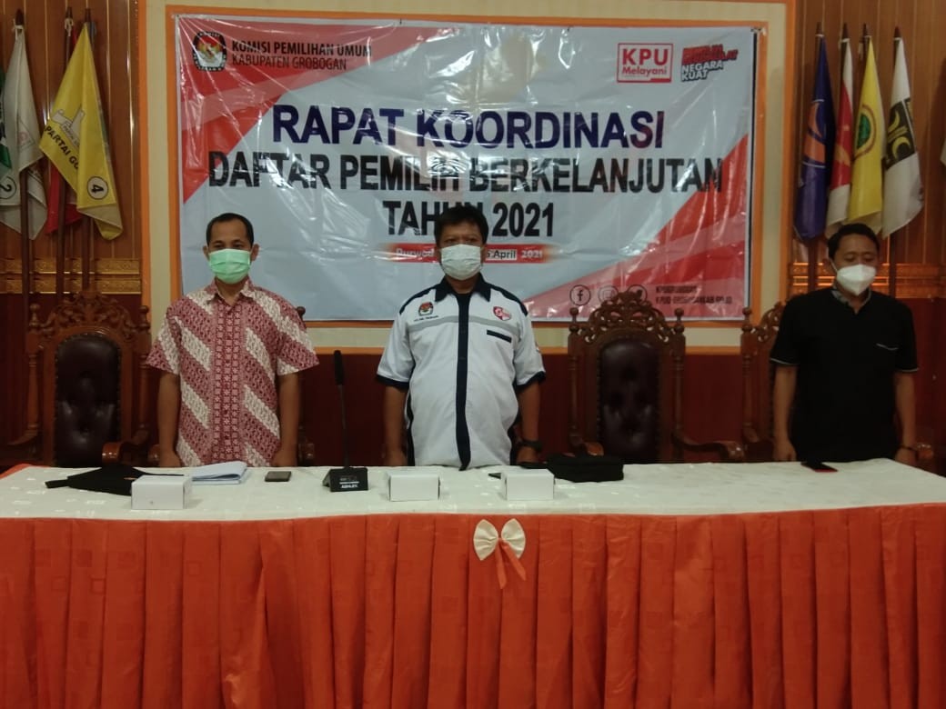 Rapat Koordinasi Daftar Pemilih Berkelanjutan Tahun 2021 dilaksanakan Rabu, 5 April 2021 oleh KPU Kabupaten Grobogan. Hadir pada kesempatan ini beberapa stakeholder, seperti Polres Grobogan, Dandim 0717 Purwodadi, Dinas Pendidikan Provinsi Jawa Tengah Cabang IV, Kemenag Kabupaten Grobogan dan Partai Politik di Kabupaten Grobogan. Acara hari ini dibuka dengan sambutan Ketua KPU Kabupaten Grobogan Agung Sutopo, S. Pi. Beliau menyampaikan betapa pentingnya Rapat Koordinasi Daftar Pemilih Berkelanjutan Tahun 2021 adalah untuk menyiapkan daftar pemilih yang komprehensif dan mutakhir. Hal ini dapat terjadi dengan bantuan stakeholder terkait. Sementara Muhammad Machruz, ST selaku Anggota KPU Kabupaten Grobogan Divisi Pemutakhiran Daftar Pemilih menjelaskan secara rinci bagaimana Daftar Pemilih Berkelanjutan tahun 2021 disusun. Beberapa masukan datang dari Polres Grobogan, Dinas Pendidikan Provinsi Jawa Tengah Cabang IV dan perwakilan Partai Politik di Kabupaten Grobogan. Masukan dari beberapa pihak tersebut, akan segera ditindaklanjuti oleh KPU Kabupaten Grobogan dengan bersurat kepada beberapa pihak terkait.