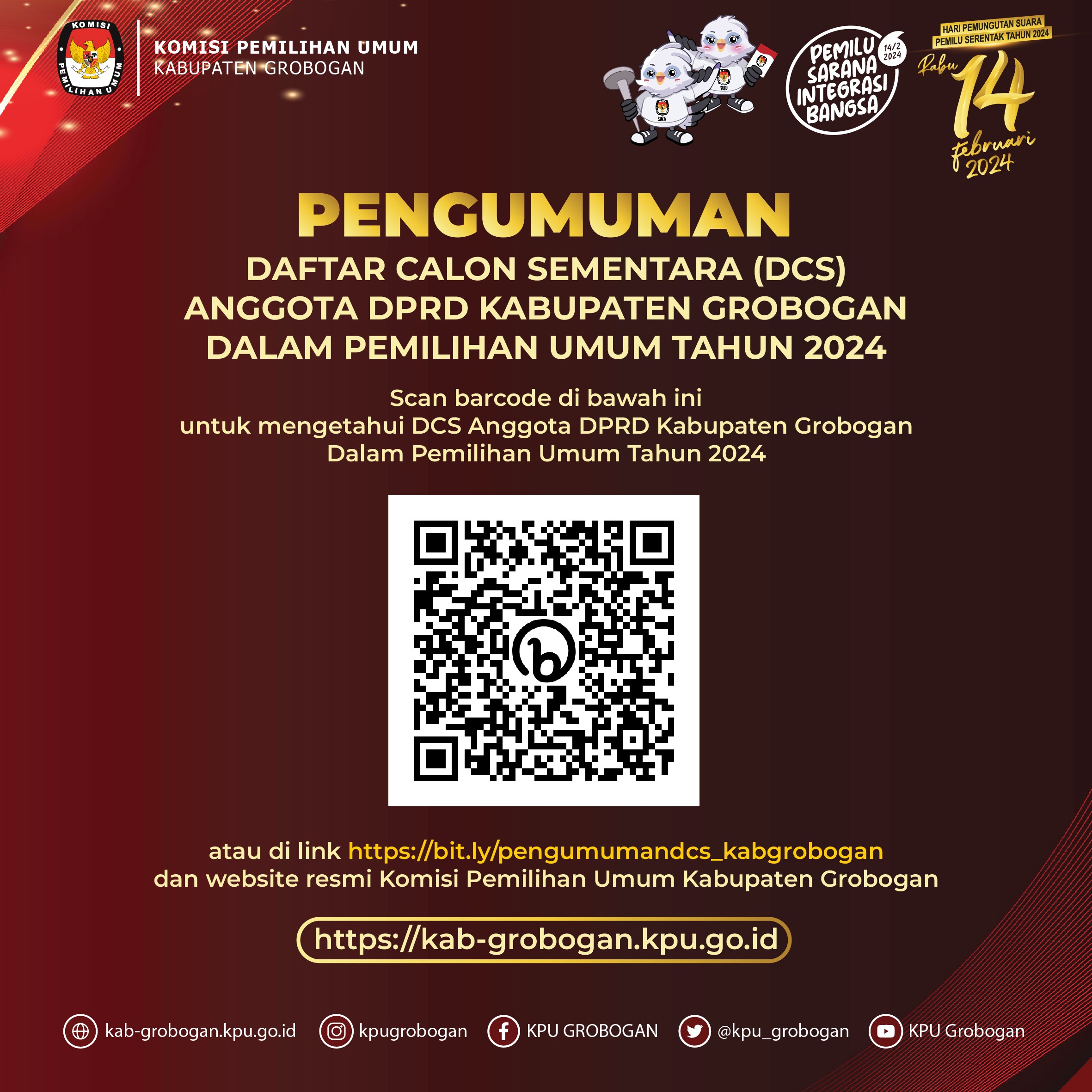 Pengumuman Daftar Calon Sementara (DCS) Anggota DPRD Kabupaten Grobogan Dalam Pemilihan Umum Tahun 2024 Sabtu, 19 Agustus 2023 07:00 2613 Pengumuman Daftar Calon Sementara (DCS) Anggota DPRD Kabupaten Grobogan Dalam Pemilihan Umum Tahun 2024, informasi selengkapnya dapat dilihat disini Baca Selengkapnya