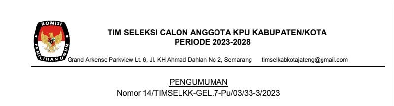 Pengumuman Hasil Seleksi Calon Anggota KPU Kabupaten/Kota di Jawa Tengah Periode 2023-2028 Gelombang VII Kamis, 31 Agustus 2023 17:03 283 PENGUMUMAN HASIL SELEKSI CALON ANGGOTA KPU KABUPATEN/KOTA DI JAWA TENGAH PERIODE 2023-2028 GELOMBANG VII dapat diunduh di sini Baca Selengkapnya