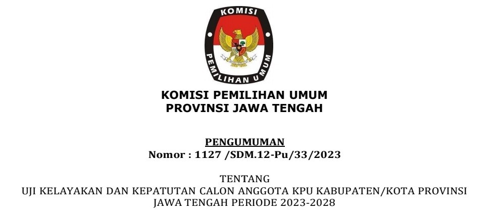 PENGUMUMAN UJI KELAYAKAN DAN KEPATUTAN CALON ANGGOTA KPU KABUPATEN/KOTA PADA 9 KABUPATEN/KOTA DI PROVINSI JAWA TENGAH PERIODE 2023-2028 Selasa, 24 Oktober 2023 16:00 124 PENGUMUMAN UJI KELAYAKAN DAN KEPATUTAN CALON ANGGOTA KPU KABUPATEN/KOTA PADA 9 KABUPATEN/KOTA DI PROVINSI JAWA TENGAH PERIODE 2023-2028 dapat diakses di sini Baca Selengkapnya