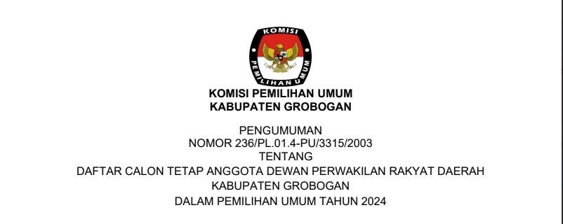 PENGUMUMAN DAFTAR CALON TETAP ANGGOTA DEWAN PERWAKILAN RAKYAT DAERAH KABUPATEN GROBOGAN DALAM PEMILIHAN UMUM TAHUN 2024 Sabtu, 04 November 2023 08:00 1553 Pengumuman Daftar Calon Tetap Anggota Dewan Perwakilan Rakyat Daerah Kabupaten Grobogan Dalam Pemilihan Umum Tahun 2024 dapat diakses di sini Baca Selengkapnya