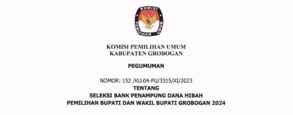 PENGUMUMAN SELEKSI BANK PENAMPUNG DANA HIBAH PEMILIHAN BUPATI DAN WAKIL BUPATI GROBOGAN 2024 Selasa, 14 November 2023 12:00 102 PENGUMUMAN SELEKSI BANK PENAMPUNG DANA HIBAH PEMILIHAN BUPATI DAN WAKIL BUPATI GROBOGAN 2024 dapat diunduh di sini Baca Selengkapnya