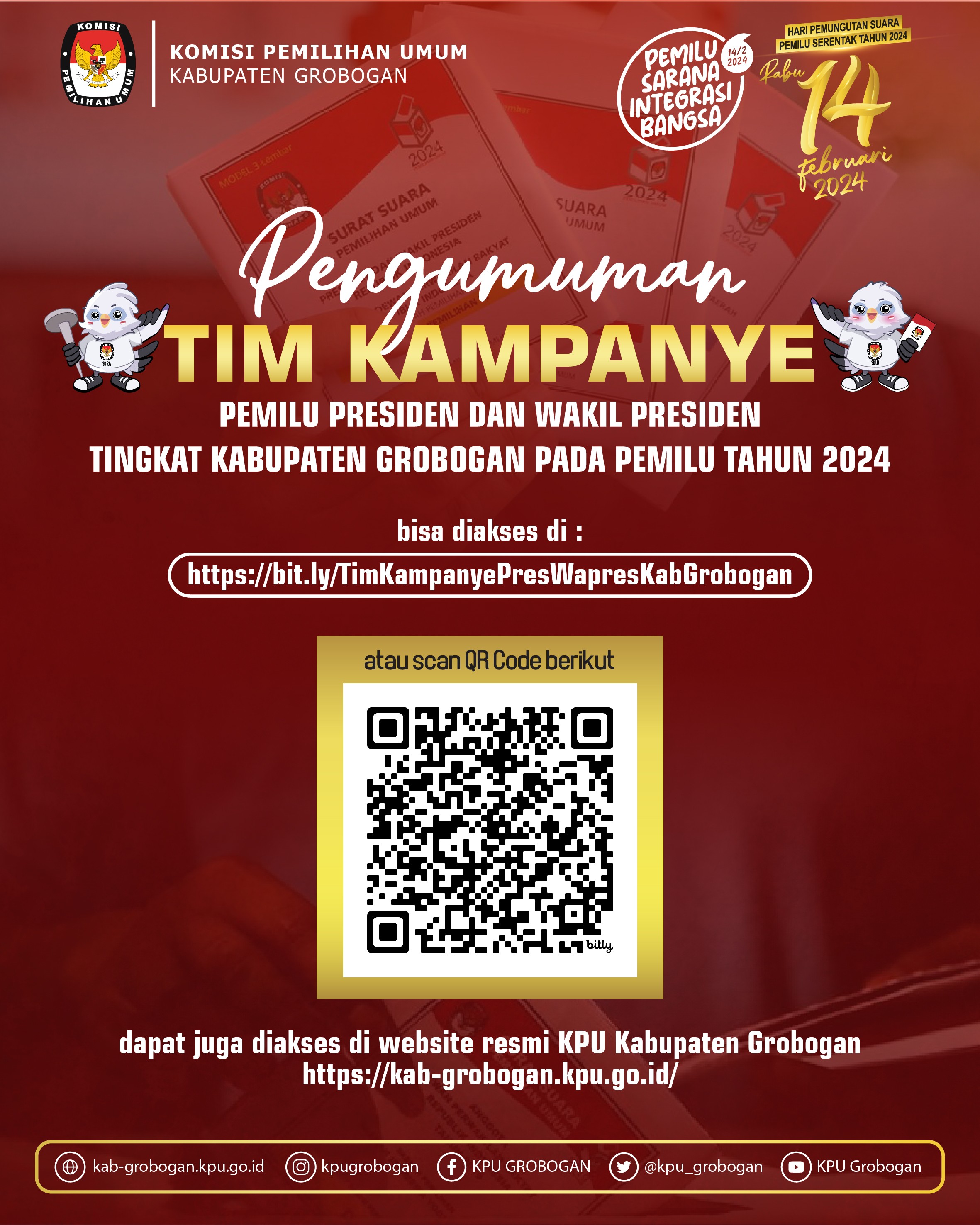 Pengumuman Tim Kampanye Pemilu Presiden dan Wakil Presiden Tingkat Kabupaten Grobogan Pada Pemilu 2024 Selasa, 28 November 2023 16:00 137 Pengumuman Tim Kampanye Pemilu Presiden dan Wakil Presiden Tingkat Kabupaten Grobogan Pada Pemilu 2024 dapat diakses di sini Baca Selengkapnya