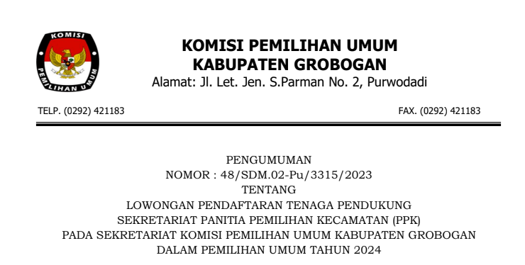 PENGUMUMAN SELEKSI TERTULIS DAN WAWANCARA TENAGA PENDUKUNG SEKRETARIAT PPK PADA SEKRETARIAT KPU KABUPATEN GROBOGAN TAHUN 2023 Sabtu, 25 Maret 2023 15:00 264 Baca Selengkapnya