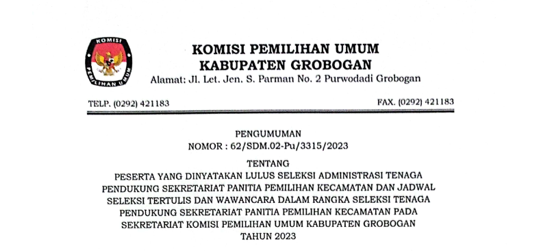 Pengumuman Hasil Seleksi Administrasi Jagat Saksana KPU Kabupaten Grobogan Sabtu, 04 Maret 2023 20:00 285 Baca Selengkapnya