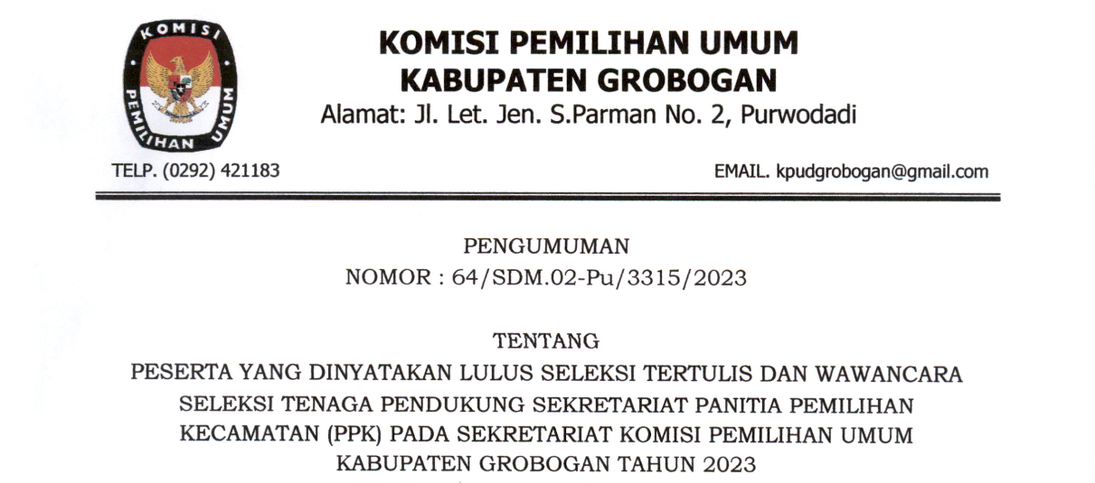 Pengumuman Hasil Seleksi Wawancara Jagat Saksana KPU Kabupaten Grobogan Rabu, 08 Maret 2023 14:00 133 Baca Selengkapnya
