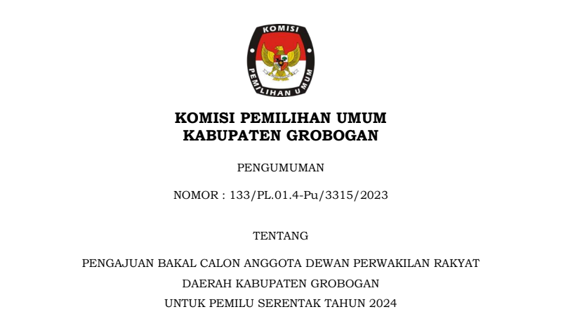 PENGUMUMAN PENGAJUAN BAKAL CALON ANGGOTA DEWAN PERWAKILAN RAKYAT DAERAH KABUPATEN GROBOGAN UNTUK PEMILU SERENTAK TAHUN 2024 Senin, 24 April 2023 00:01 482 Berikut kami sampaikan Pengumuman Nomor : 133/PL.01.4-Pu/3315/2023 Tentang Pengajuan Bakal Calon Anggota Dewan Perwakilan Rakyat Daerah Kabupaten Grobogan Untuk Pemilu Serentak Tahun 2024 Baca Selengkapnya