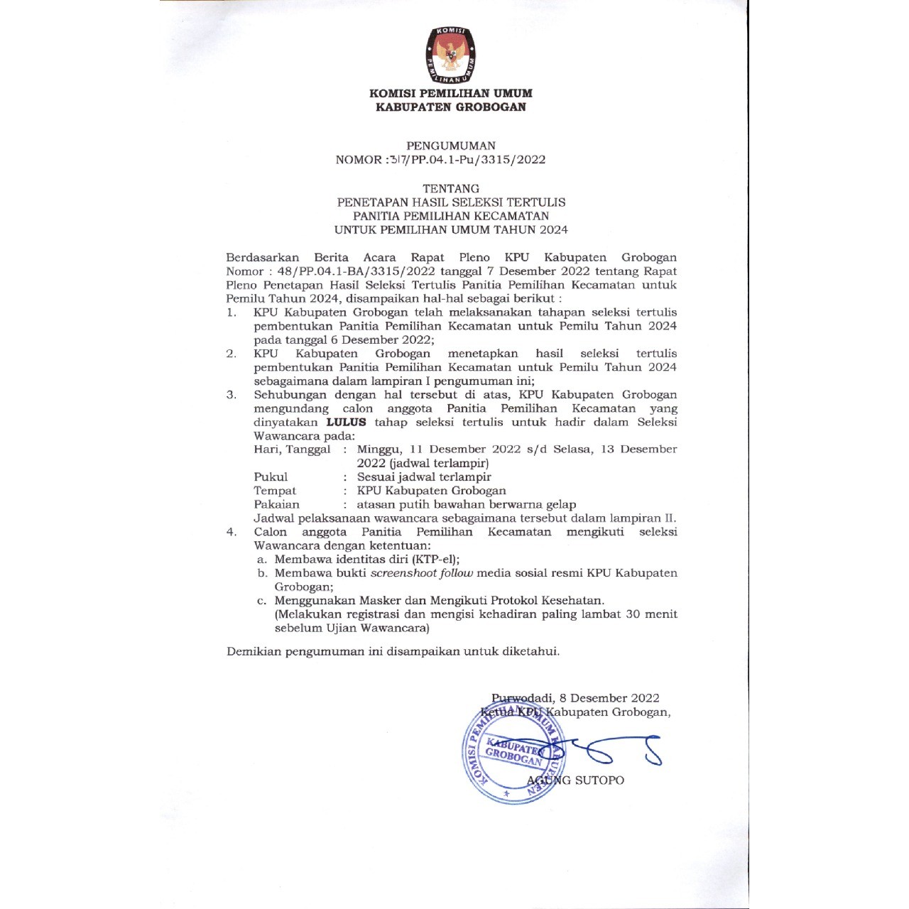 Pengumumam Penetapan Hasil Seleksi Tertulis Panitia Pemilihan Kecamatan (PPK) Kabupaten Grobogan Kamis, 08 Desember 2022 00:00 477 Pengumumam Penetapan Hasil Seleksi Tertulis Panitia Pemilihan Kecamatan (PPK) Kabupaten Grobogan >>> unduh Baca Selengkapnya