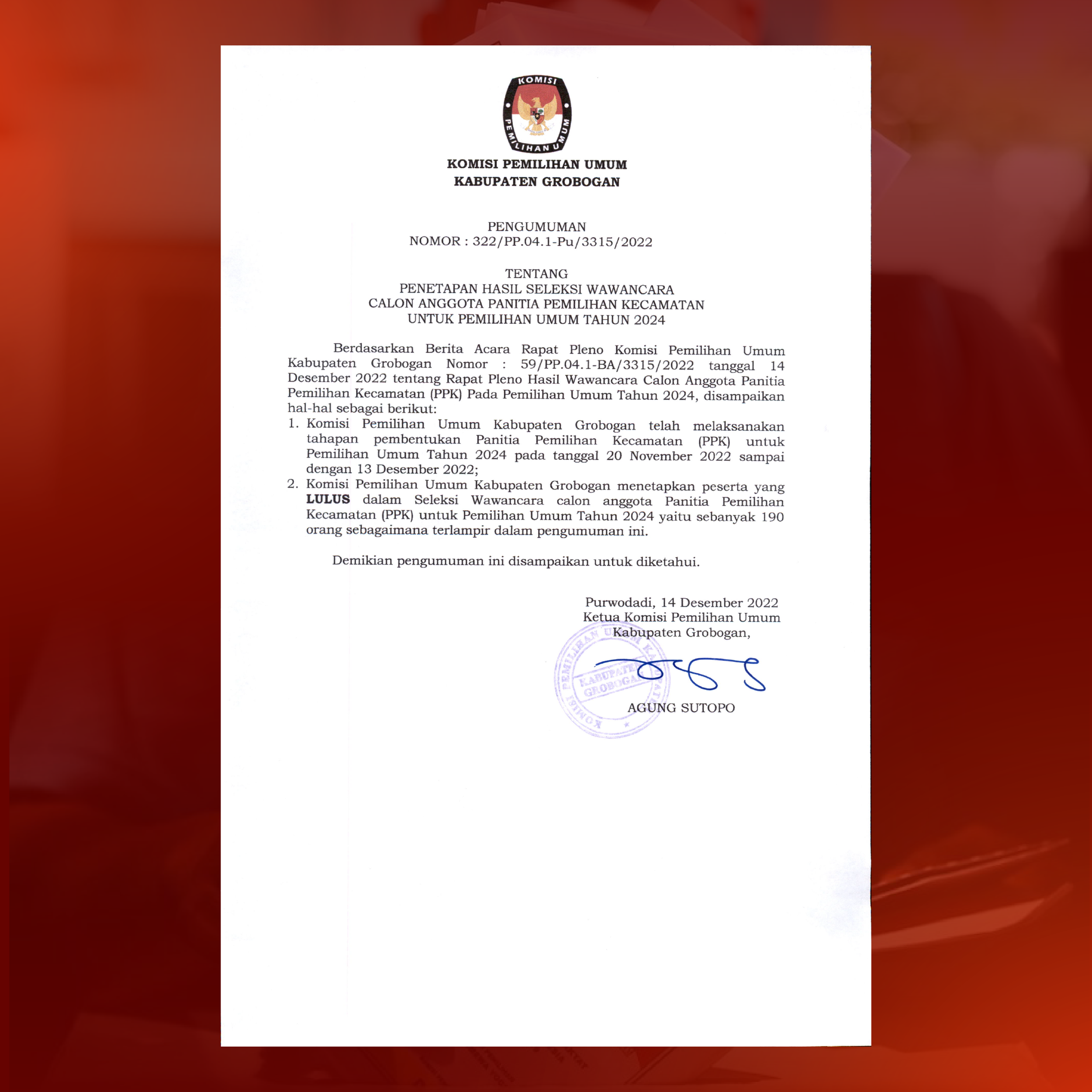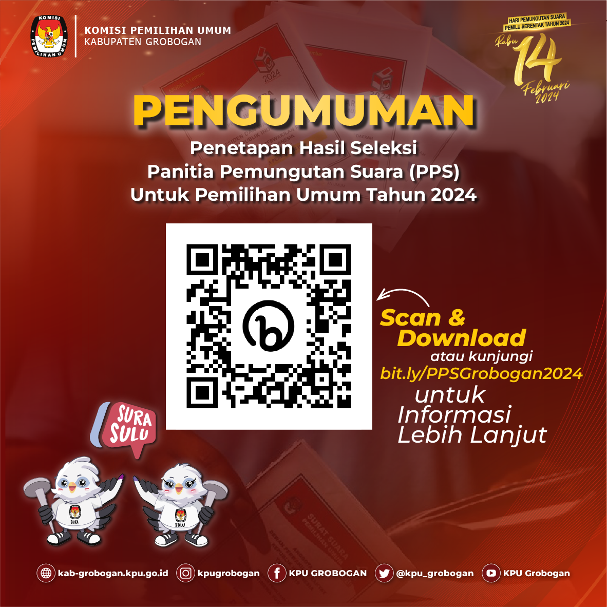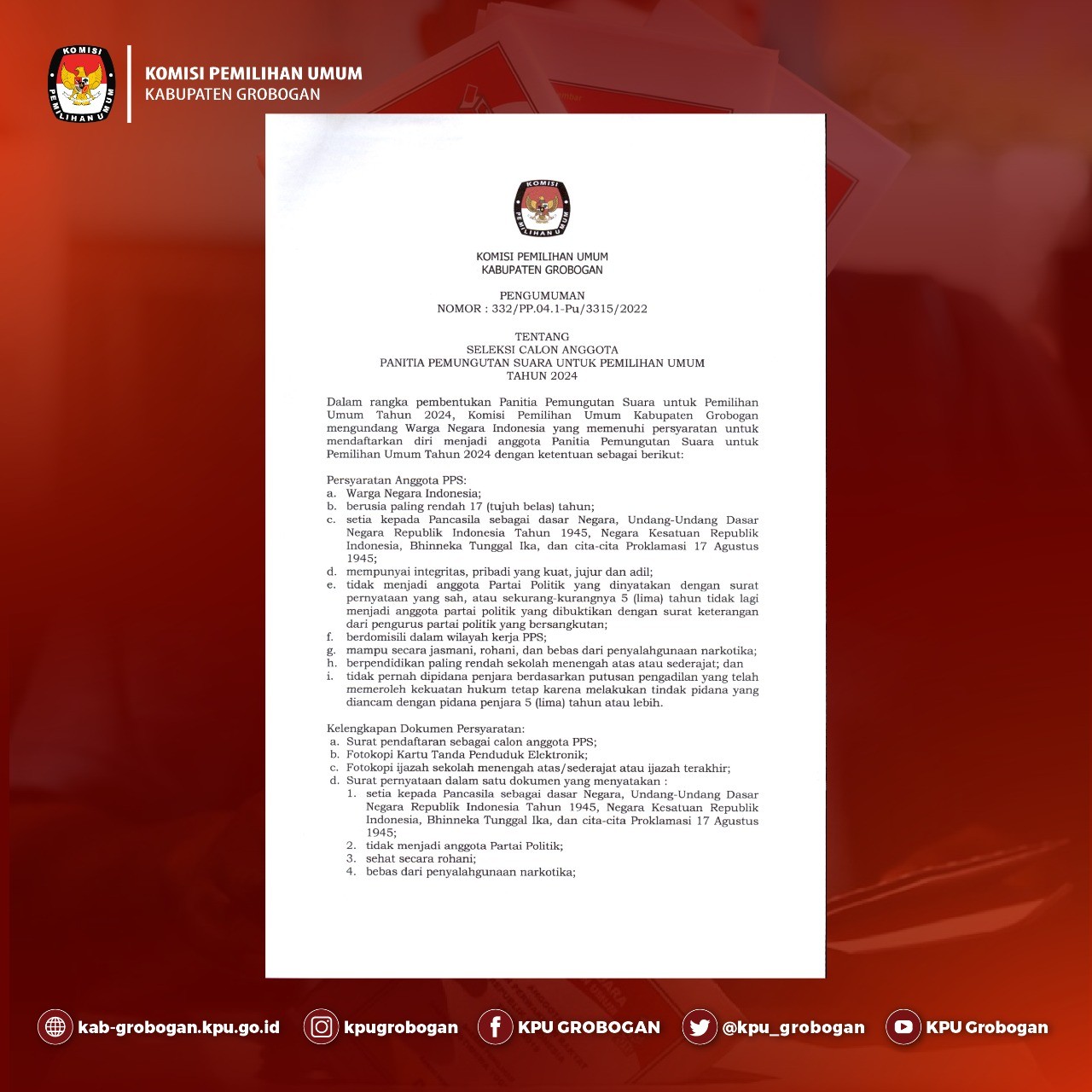 Pengumuman Seleksi Calon Anggota Panitia Pemungutan Suara (PPS) Untuk Pemilihan Umum Tahun 2024 Kabupaten Grobogan Minggu, 18 Desember 2022 00:00 1746 Pengumuman Seleksi Calon Anggota Panitia Pemungutan Suara (PPS) Untuk Pemilihan Umum Tahun 2024. Unduh Baca Selengkapnya