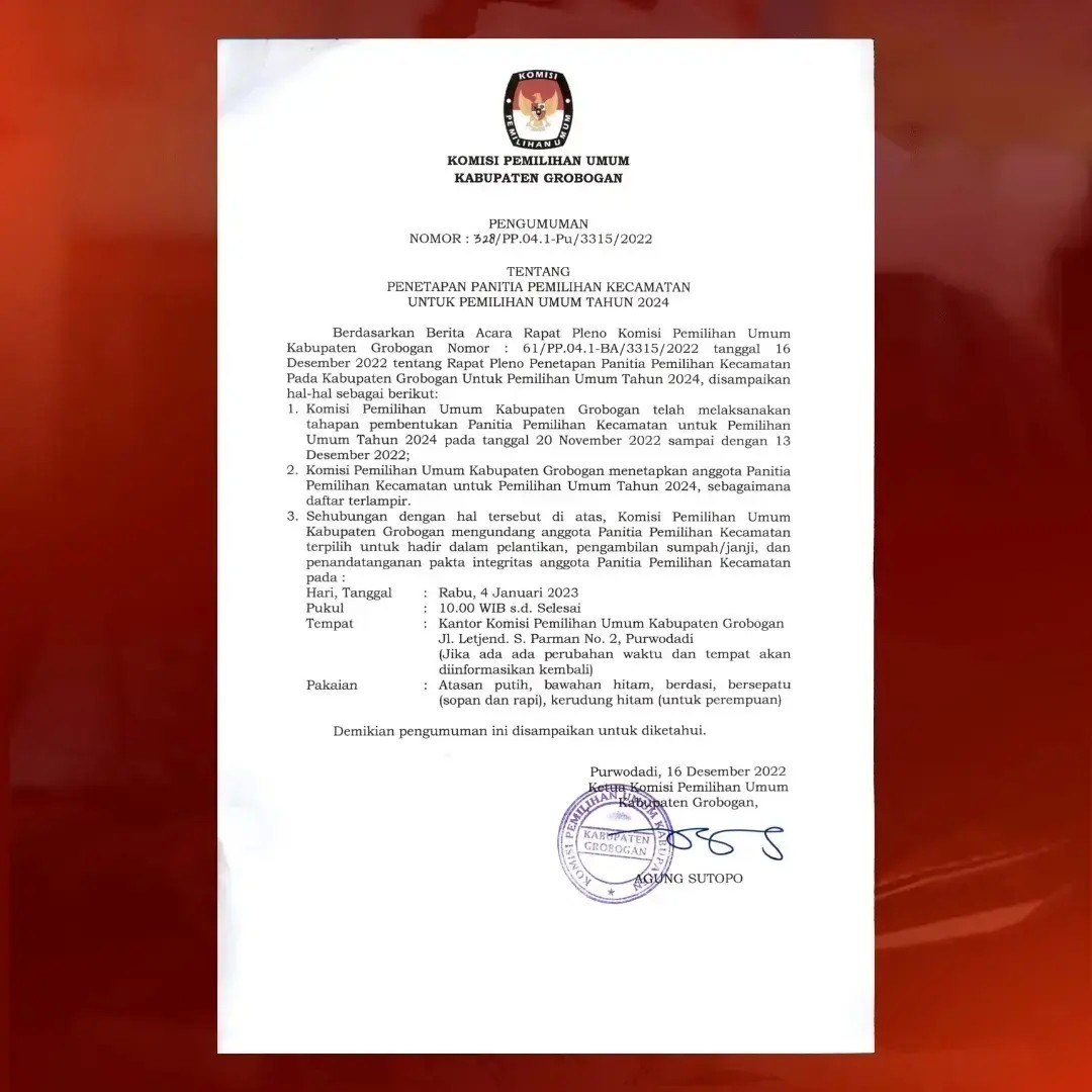 Pengumuman Penetapan Panitia Pemilihan Kecamatan (PPK) Untuk Pemilihan Umum Tahun 2024 Kabupaten Grobogan Jumat, 16 Desember 2022 00:00 432 Pengumuman Penetapan Panitia Pemilihan Kecamatan (PPK) Untuk Pemilihan Umum Tahun 2024. Unduh Baca Selengkapnya