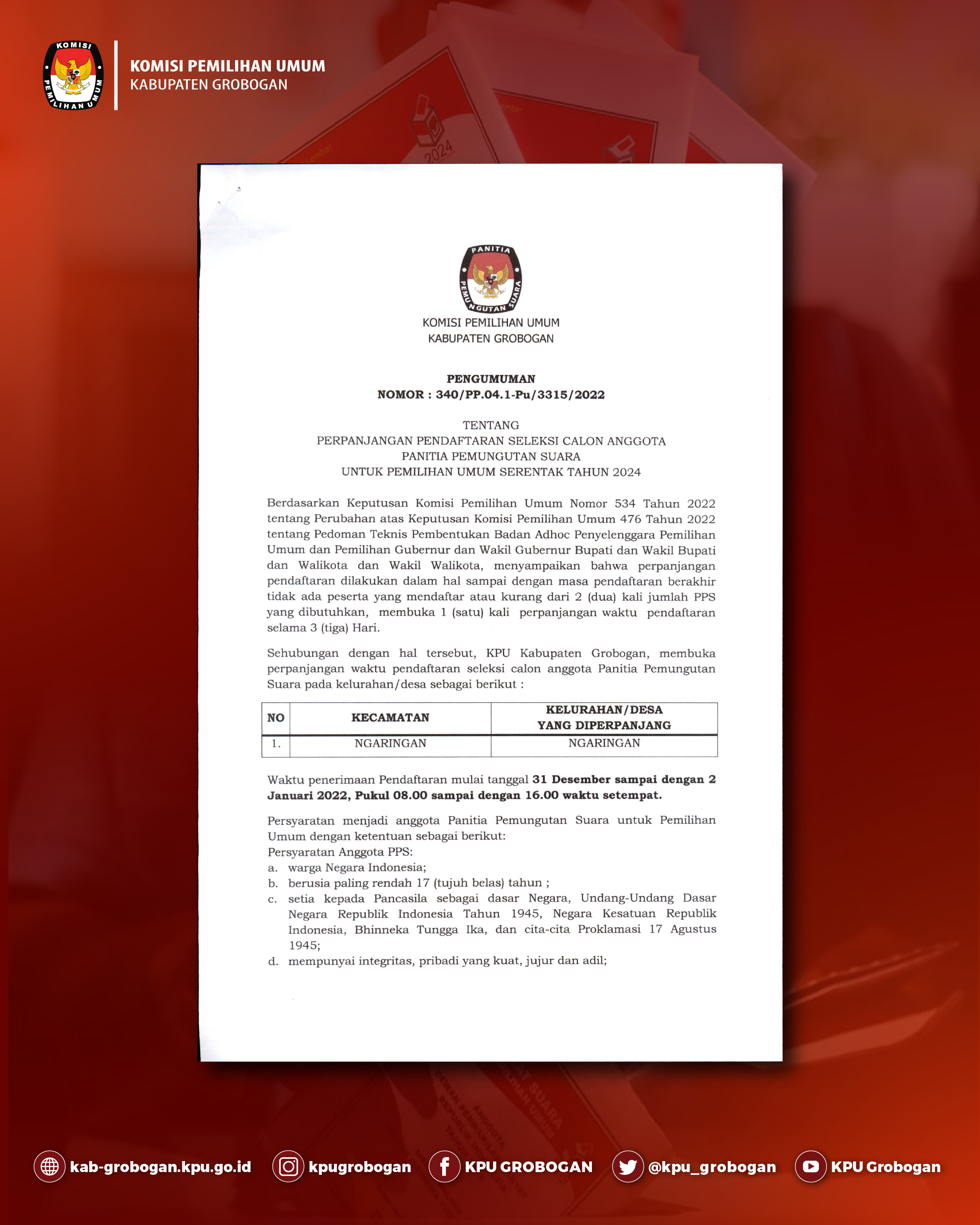 Pengumuman Perpanjangan Pendaftaran Seleksi Calon Anggota Panitia Pemungutan Suara Untuk Pemilihan Umum Serentah Tahun 2024 KPU Kabupaten Grobogan Sabtu, 31 Desember 2022 07:00 270 Pengumuman Perpanjangan Pendaftaran Seleksi Calon Anggota Panitia Pemungutan Suara Untuk Pemilihan Umum Serentah Tahun 2024 KPU Kabupaten Grobogan. Unduh Baca Selengkapnya