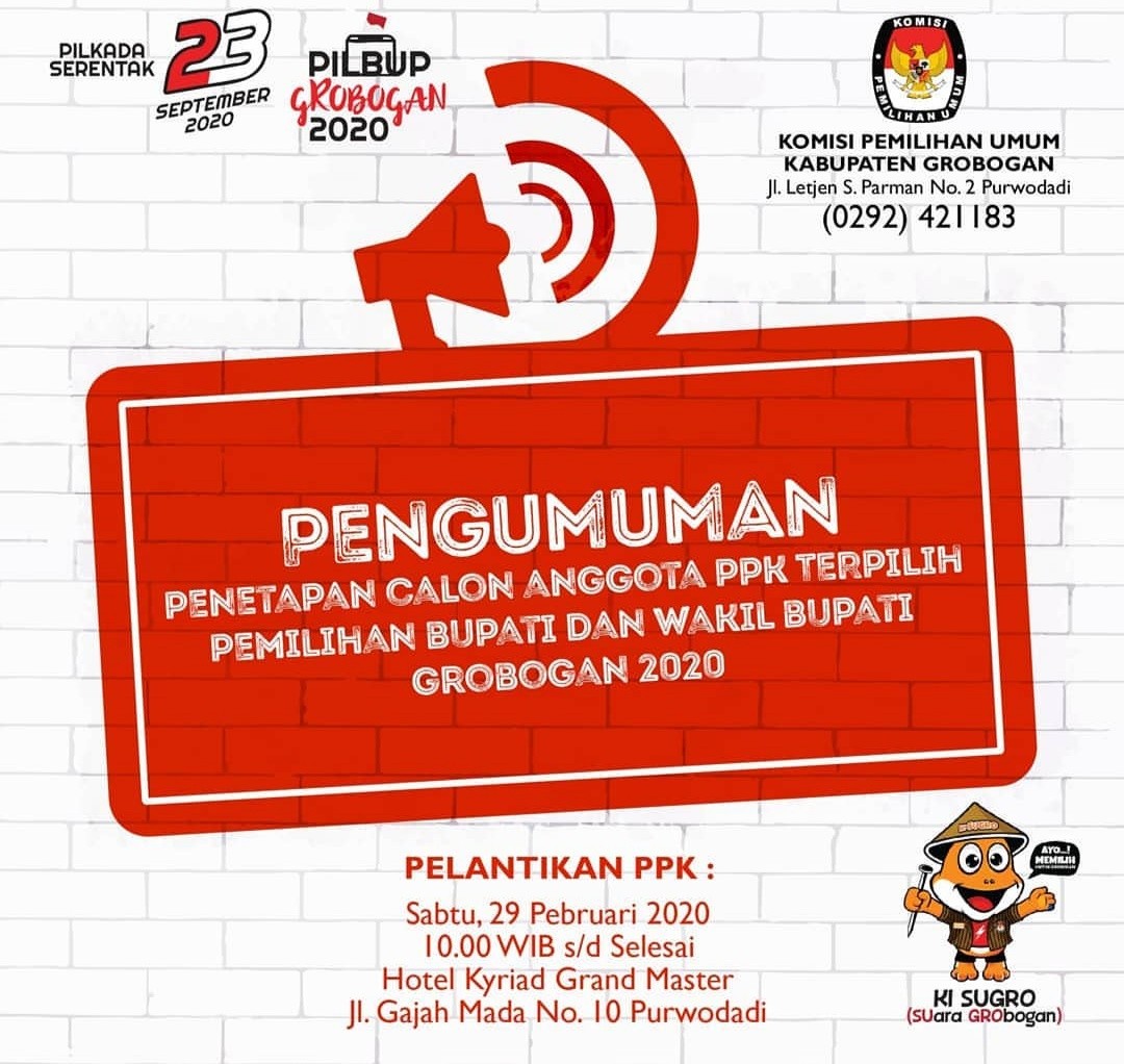 Berikut kami sampaikan Pengumuman Nomor 21/KPU. Kab-012.329260/II/2020 Tentang Seleksi Calon Anggota Panitia pemungutan Suara Pemilihan Bupati Dan Wakil Bupati Grobogan Tahun 2020.