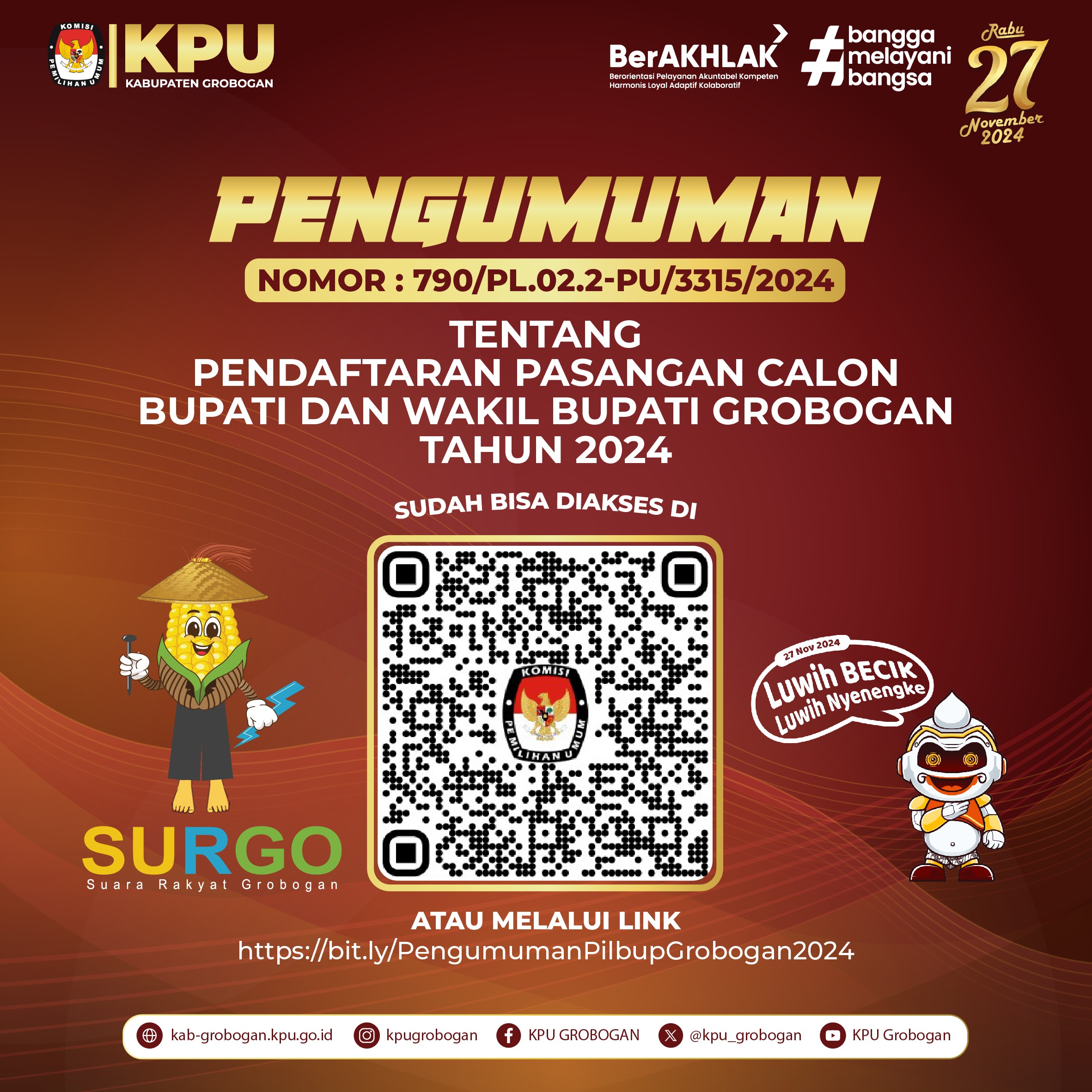 Hai #temanpemilih , KPU Kabupaten Grobogan mengajak #temanpemilih untuk melihat dan mempelajari Visi, Misi dan Program dari Pasangan Calon Bupati dan Wakil Bupati Grobogan Tahun 2024. Partisipasi aktif #temanpemilih menentukan masa depan Kabupaten Grobogan.
