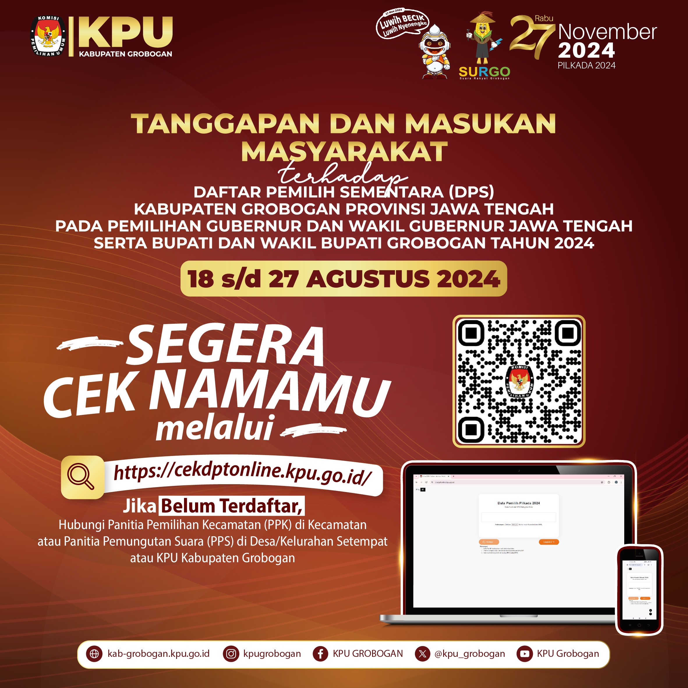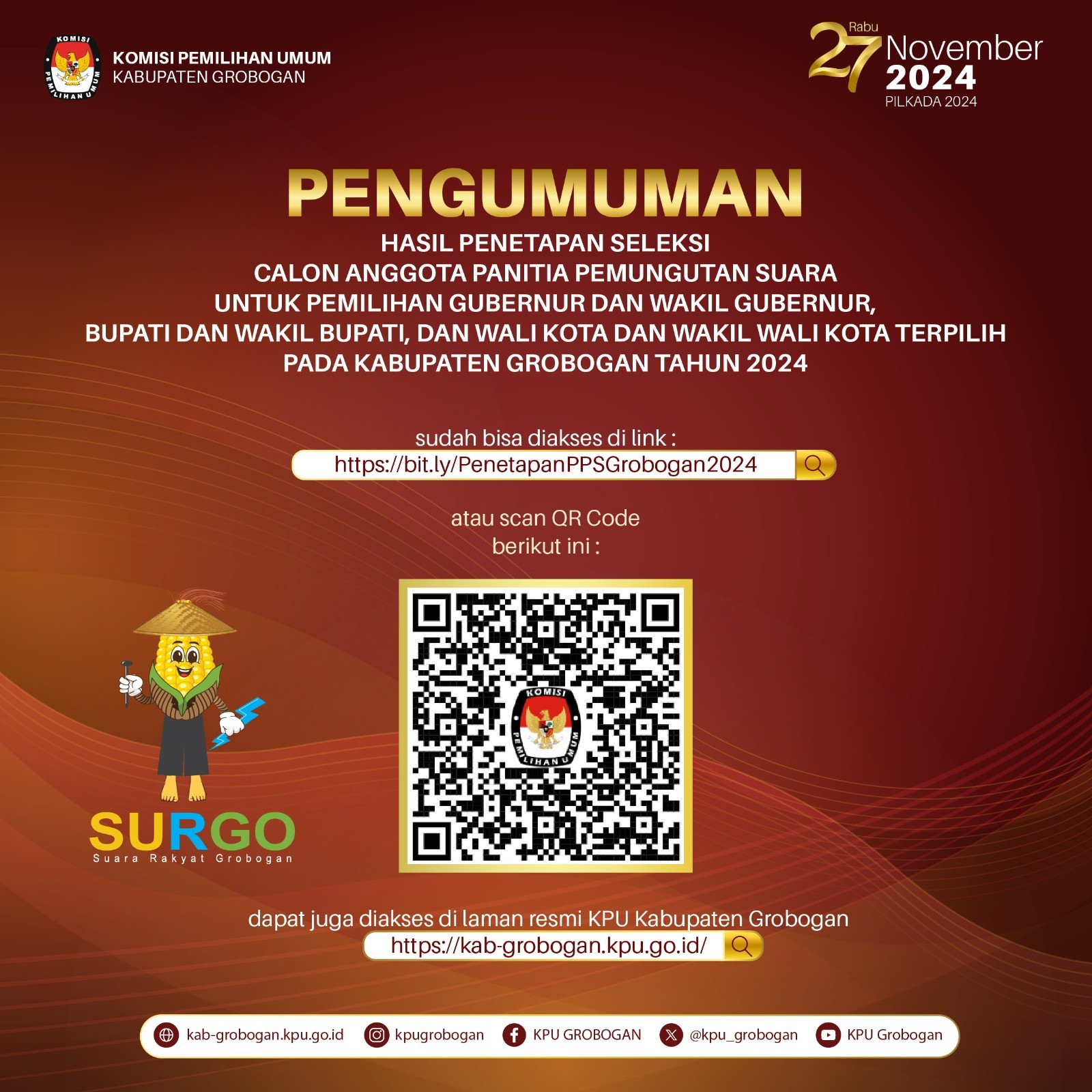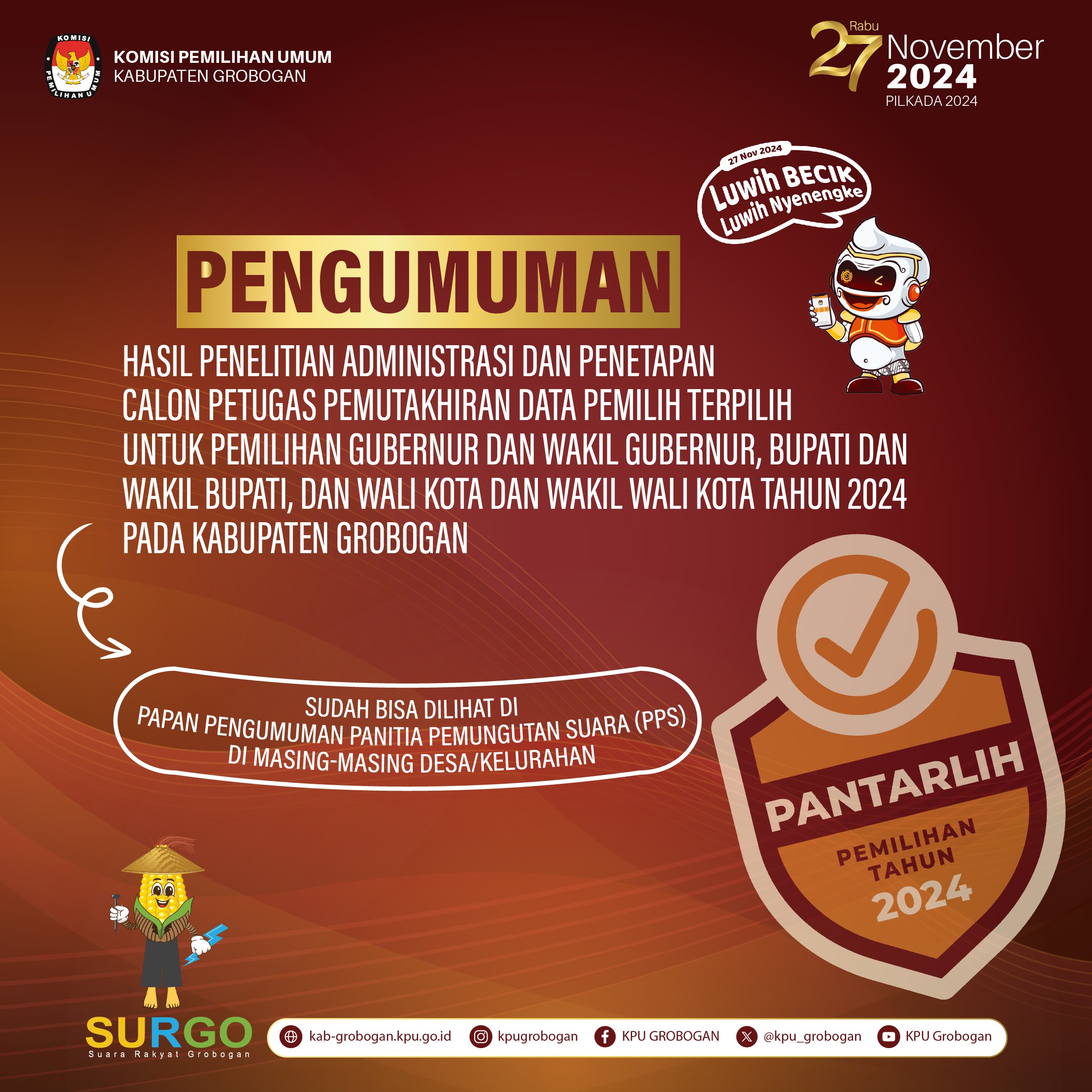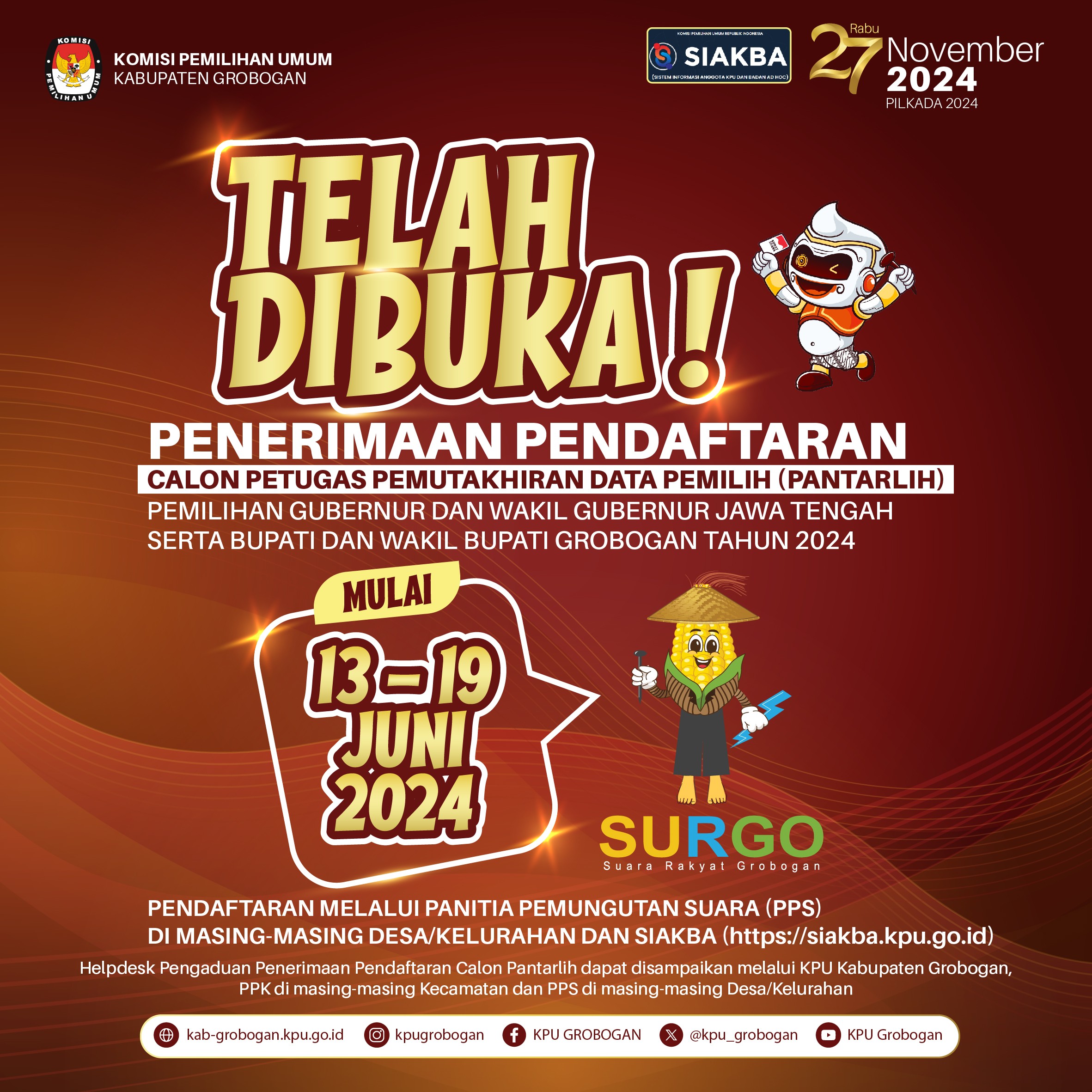 Dalam rangka pembentukan Calon Petugas Pemutakhiran Data Pemilih untuk Pemilihan Gubernur dan Wakil Gubernur, Bupati dan Wakil Bupati, dan Wali Kota dan Wakil Wali Kota Tahun 2024, Komisi Pemilihan Umum Kabupaten Grobogan melalui Panitia Pemungutan Suara mengundang Warga Negara Indonesia yang memenuhi kualifikasi untuk mendaftarkan diri menjadi Pantarlih dengan ketentuan sebagai berikut: